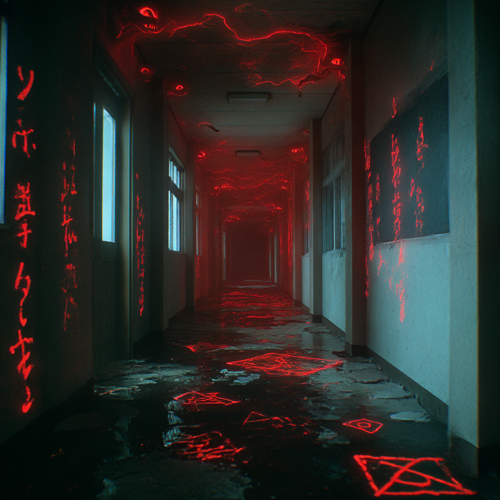 Dark rock horror with powerful low-tone female vocals, Tempo 140 BPM, Distorted electric-guitar riffs with reverb-heavy bass line, Mixture of Japanese rock groove and cinematic horror sound design—pounding drums, reversed breathing samples, glitchy echoes, Emotional yet fierce; the tone shifts between ritualistic rhythm and cathartic metal explosion