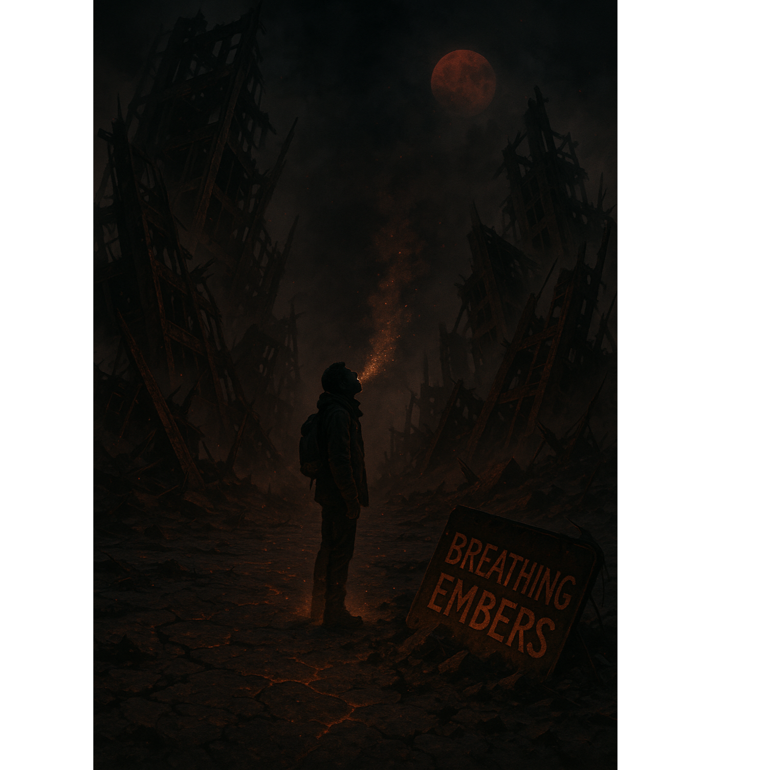 Melodic doom/death metal with mid-tempo pacing and layered vocal dynamics, Vocals alternate between deep baritone cleans, mid-range screams, spoken passages, and harmonized chant-style hooks, Guitars blend slow, crushing doom riffs with melodic harmonized leads, tremolo passages, and palm-muted chugs, Verses carry slower emotional weight; choruses and breakdowns intensify with syncopated drums and soaring lead lines, Clean vocals express sorrow or reflection; screams deliver urgency and collapse, Backing vocals contrast the lead—appearing as whisper trails, chanted echoes, or shouting refrains, Guitar solo section should rise from ambient layering into an expressive melodic peak, then dissolve into atmosphere, Overall tone: tragic, powerful, introspective, and relentless—balancing emotional gravity with controlled aggression, Ideal for stories of ruin, downfall, resistance, or remembering a world that has passed, Tempo range: 80–110 BPM