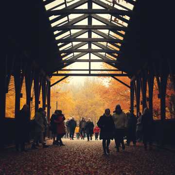 Fun, immersive, festival-ready — evokes crisp early-fall air, roasted nut aromas, laughter, and joy near the Old Bridgeton School and Covered Bridge Festival