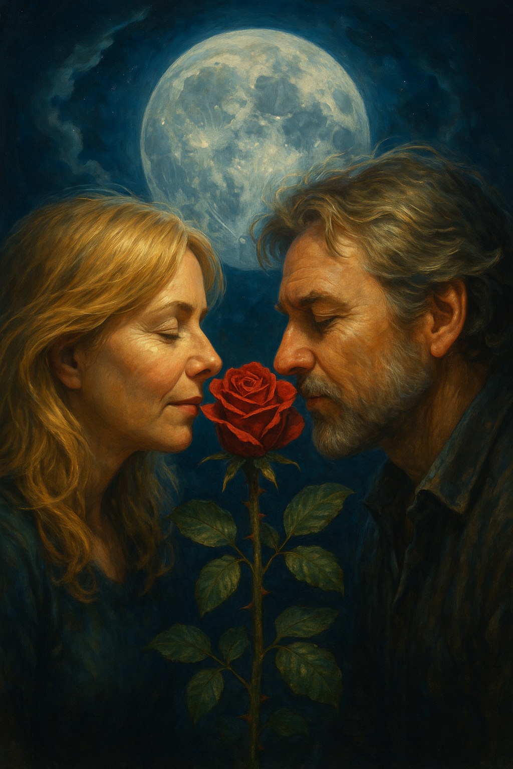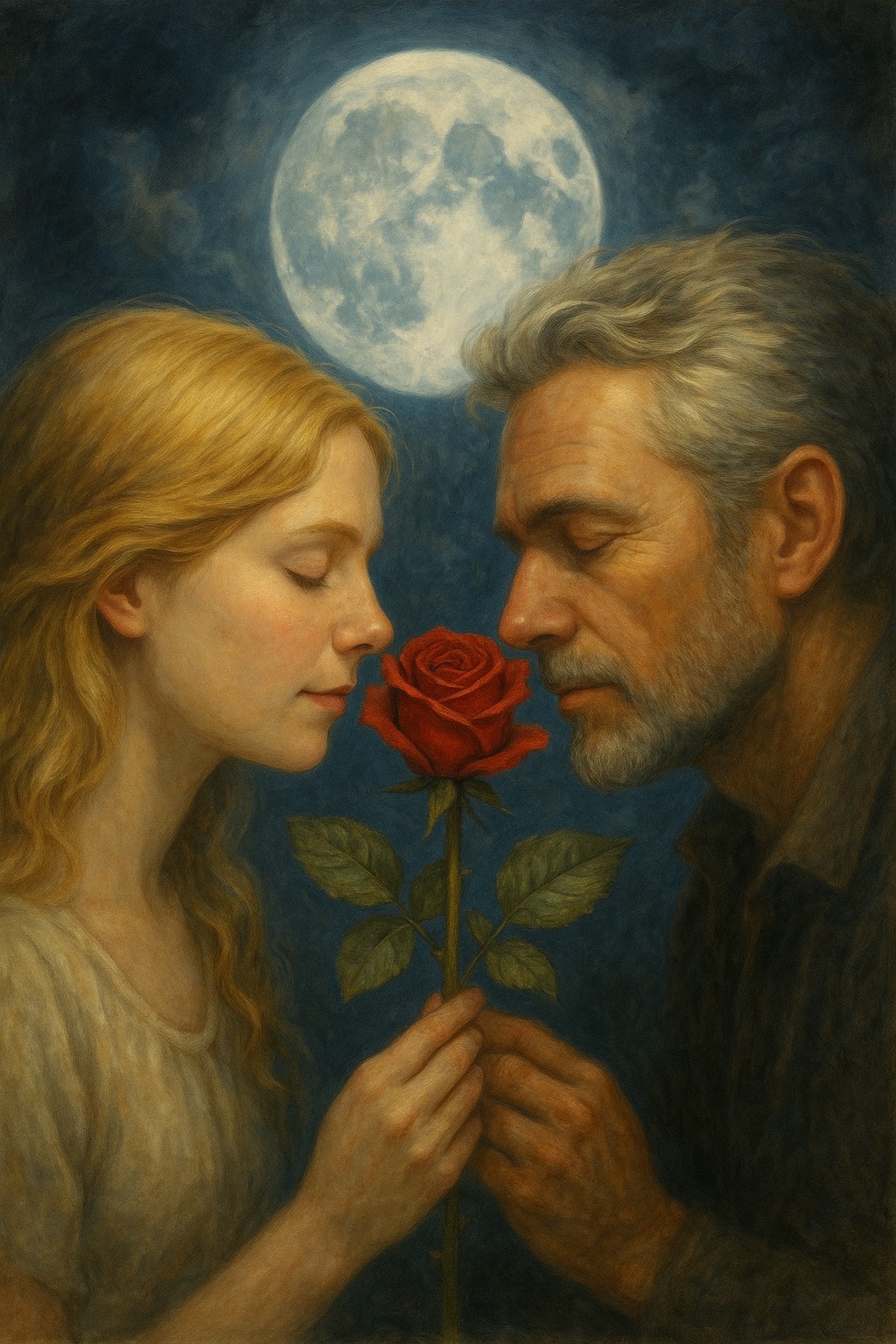 A slow, emotional, cinematic folk song that tells a poem, The poem is spoken not song, only told, guided by atmospheric instrumentation, The male narrator voice is a warm, gravelly baritone — calm, introspective, and tender — occasionally layered with an airy, ethereal female backing vocal for emotional depth, The lyrics explore the transformation of love through the metaphor of a rose, using rich imagery and mystical symbolism, The music supports the poem, Acoustic guitar is fingerpicked with open chords, setting a grounded, intimate base, Light ambient pads add atmosphere, while soft cello and minimalist piano underline key emotional turns, Subtle frame drum pulses like a heartbeat during moments of inner awakening, The tone is romantic but strong, gentle but powerful — ideal for telling a poetic story, Inspired by the sound of cinematic folk, poetic baritone delivery, and ambient neoclassical textures, Think dreamlike forests, moonlit transformation, emotional b