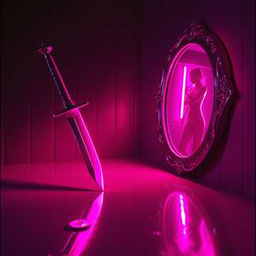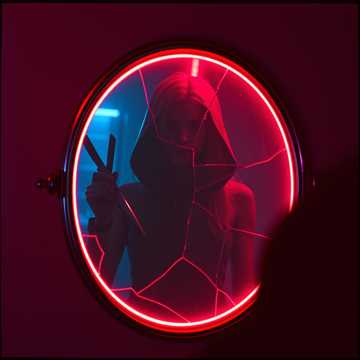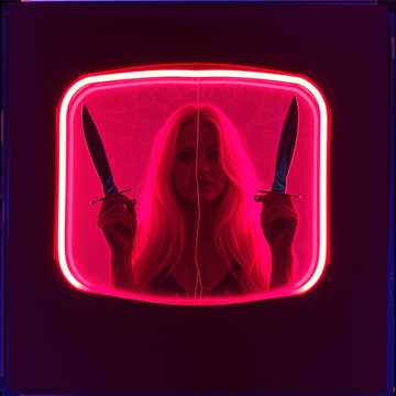 studio recording, catchy female vocalist, emotional female vocals, heavy guitar riffs, dark melody, powerful chorus, echoing, synth pop, neon, danger, glam metal, punk band, synthesizer-driven, synthwave, dark, evil