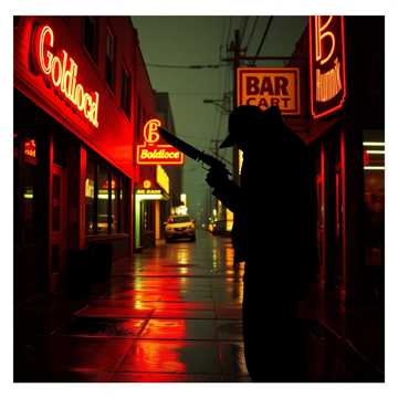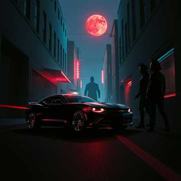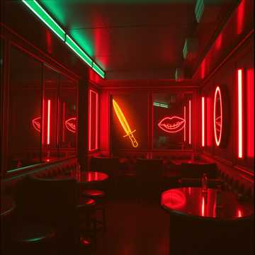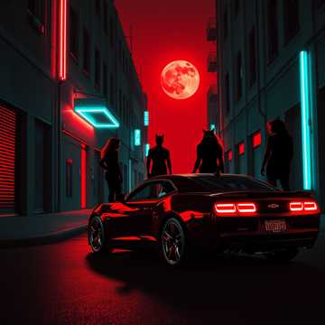 studio recording, clear sound, intense beats, rough male voice, heavy guitar riffs, dark melody, powerful chorus, echoing, synth pop, neon, danger, glam metal, punk band, synthesizer-driven, synthwave, dark, evil