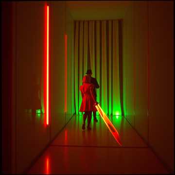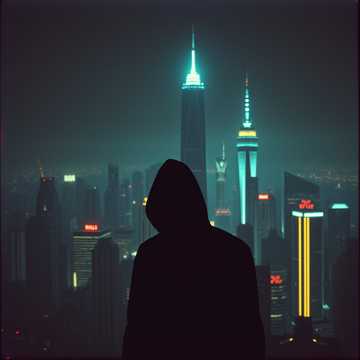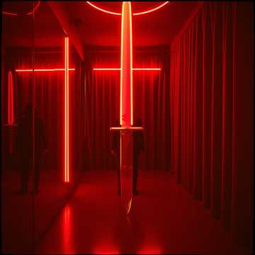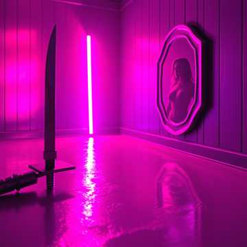 studio recording, male vocals, heavy guitar riffs, dark melody, powerful chorus, echoing, synth pop, neon, danger, glam metal, punk band, synthesizer-driven, synthwave, dark, evil