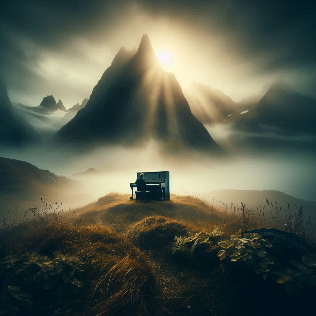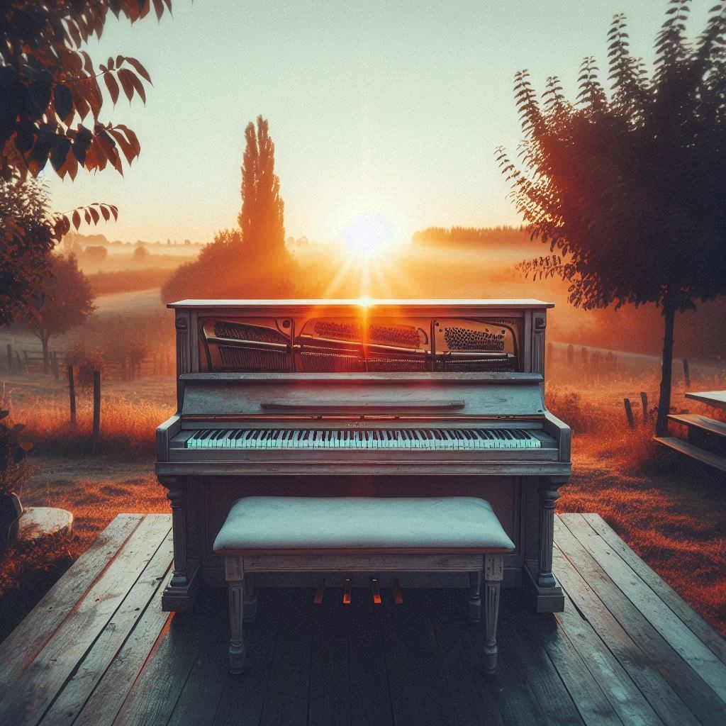 Grand Piano Melody, orchestral backup including soft French horn, violins, cellos, Oboe solo, modern tempo and theme, emotional rises with soft landings