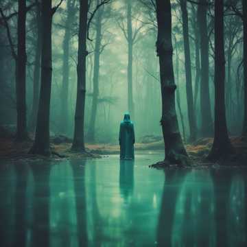 A dark ambient piece opens with a deep forest drone, weaving in distant water effects, Slow, arpeggiated synths unfold, layered with low, resonant bell tones and drenched in ethereal echoes, Sparse textures pulse gently, maintaining a solemn, reflective mood and very low, immersive energy
