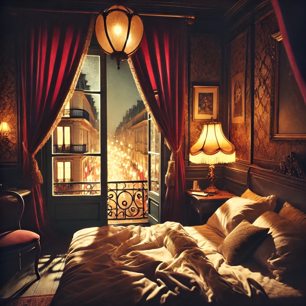 French chanson with bluesy pop elements, melancholic mood, jazzy piano, bass, soft drums, male lead vocals with soulful female backup harmonies, intimate and longing, inspired by late-night city alone, similar to classic French musicals, vocal duet style