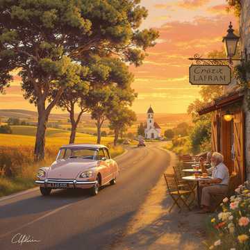 French road trip song in the style of classic chanson, acoustic guitars, upright bass, accordion, brushed drums, slightly nostalgic feeling, summer evening light, vocals with a laid-back poetic vibe