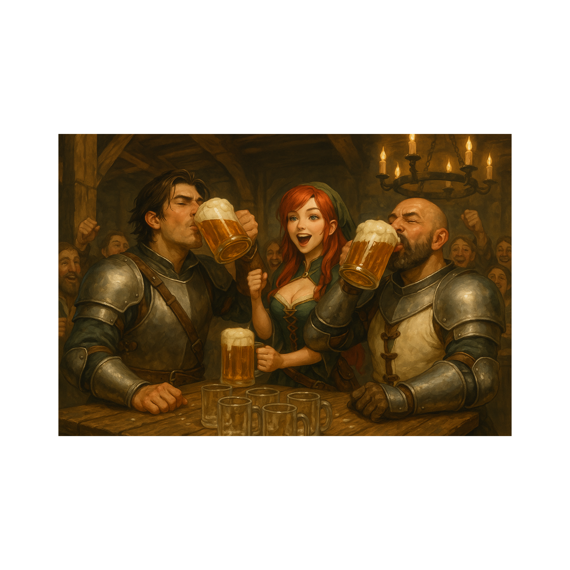 [ambient: warm wooden tavern acoustics, low ceiling, close crowd resonance]