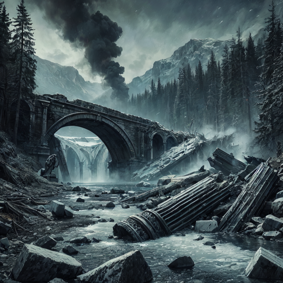 [instruments: detuned pipe organ, bowed metals, sub drones, anvil strikes, distorted taiko, bass feedback, granular synth textures, fractured choir, low mechanical rumble]