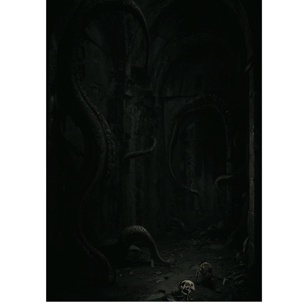 [atmosphere: the echo of the Kraken — god as machine, voice as earthquake, prayer as corrosion, No light remains, only pressure, gravity, and dread made sound, ]