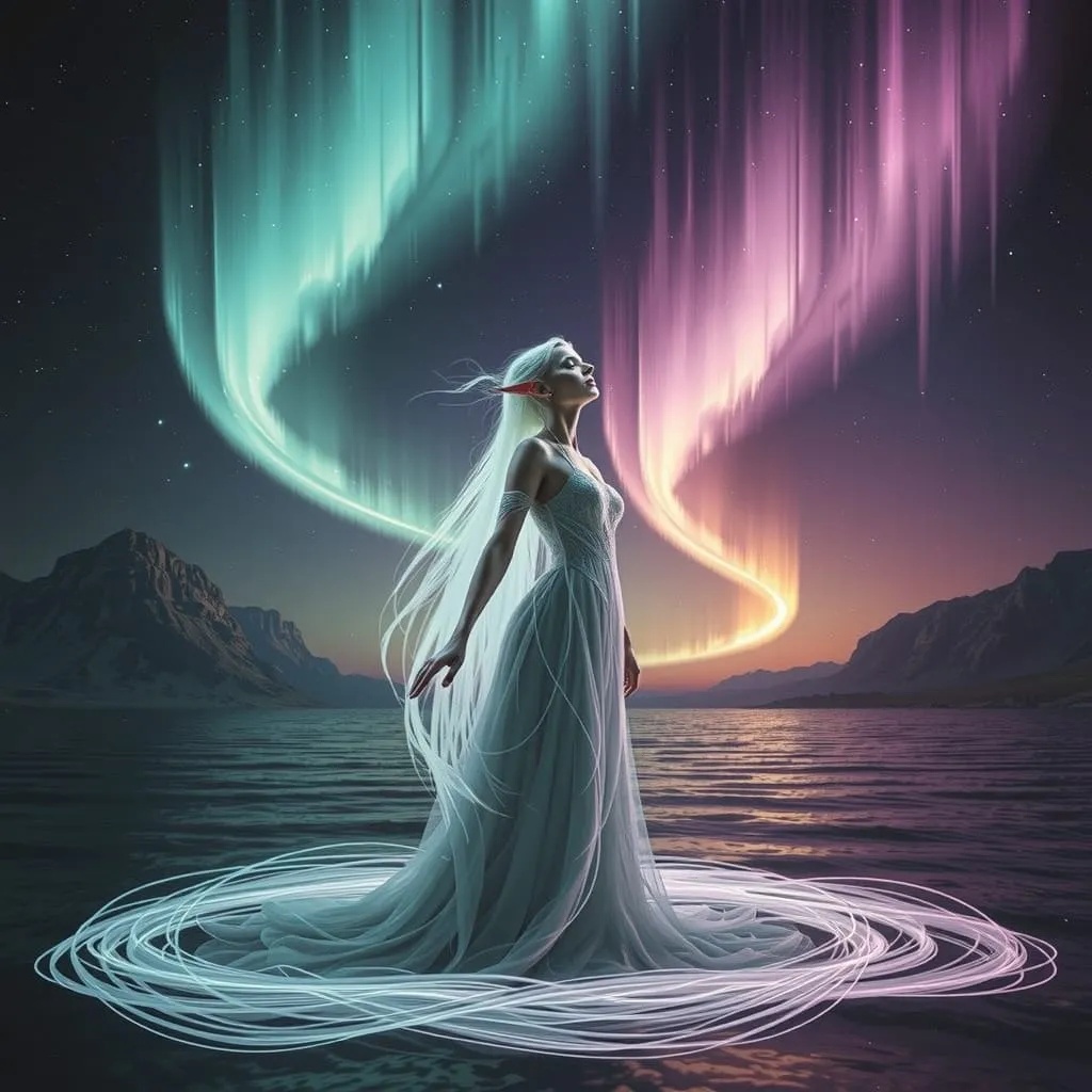 Spoken Poem, Poetry, Ethereal Scandinavian-accented Female Vocal in English, Spoken Word with sung Chorus and Final Chorus only, Spoken delivery should be soft, breathy, and intimate almost whispered at times, Sung sections should be cinematic, clear, and emotionally expressive, Polyphonic, Pure space ambient soundscape, no melody or drums, built from ethereal static, auroral hissing, deep gravity drones, rich tones, and soft noise, drenched in echo and lush 3D, adorned by subtle binaural beats for transcendental impact, soundscape, glitches, vinyl crackle, floating, field recording, ambient, surround sound, quiet storm