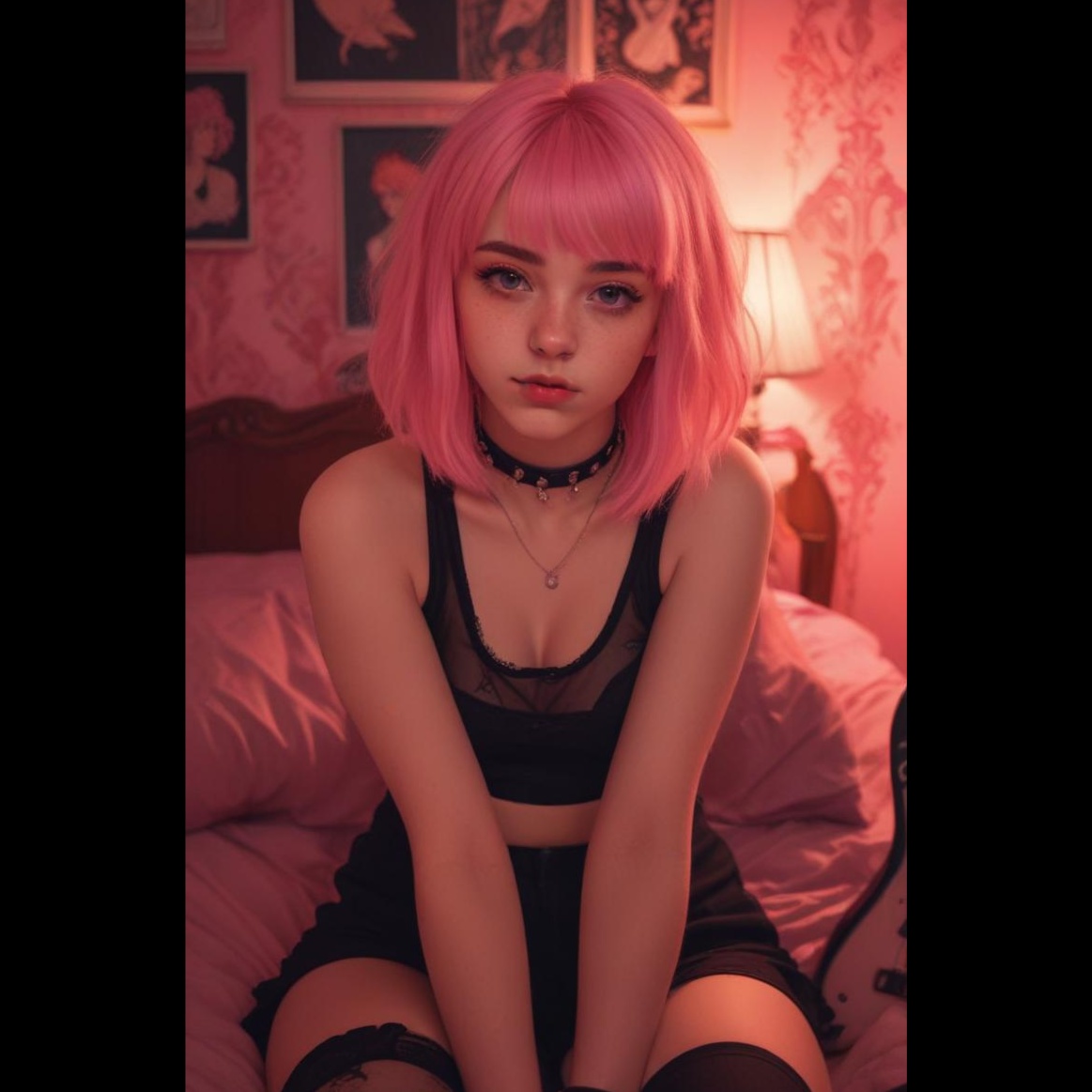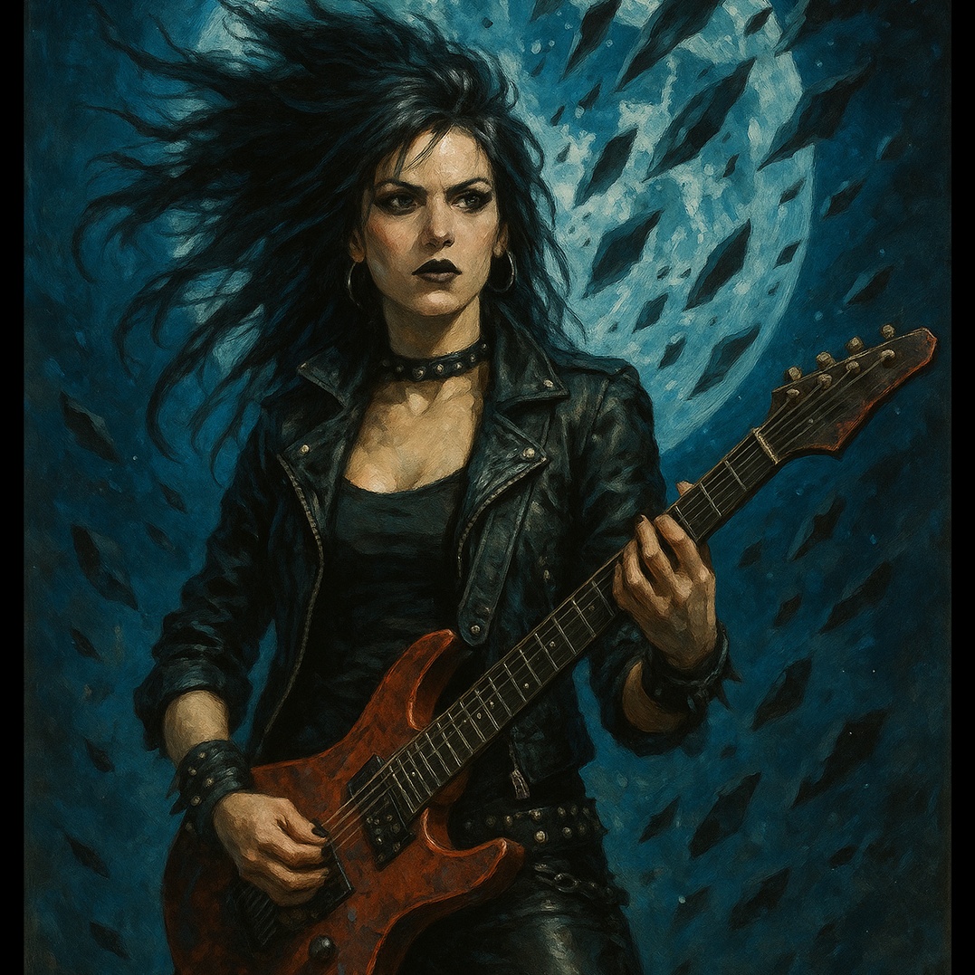 Kick off with syncopated distorted guitars and crisp drum grooves, fused with glam punk flair and deathrock atmospherics, Basslines pulse beneath shimmering synth accents, Female vocalist exploits dynamic range, agile melodic runs, and ethereal head voice, vocals expertly EQ’d to cut through the dense mix with lush clarity, Chorus explodes with rich melodic hooks and gothic harmonies, Breakdowns inject gothpunk grit, reverb-drenched guitars, and floating vocal lines above the chaos, Throughout, vibrant dynamics are preserved; high-end is balanced for a polished, radio-ready sound, ‑heavy reverb, ‑cathedral-style reverb, ‑long echo tails, ‑distant-sounding vocals, ‑ghostly vocal trails, ‑washed-out background layers, ‑vocal spillover, ‑spacey mixdown, ‑overly ambient production