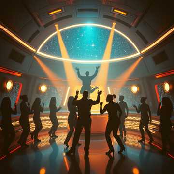 A heavy, bubbly funk‑Electronica party track with thick bass, fizzy synths, glowing textures, and bright, playful energy, Heavy pan flute stabs, neon‑fruit sound design, and a joyful Cantina‑party vibe, The groove should feel juicy, effervescent, and cosmic, like the crew drinking a magical fruity tonic that turns the whole ship into a dance floor, Big drums, rubbery bass, swirling electronic bubbles, and a comedic, celebratory tone