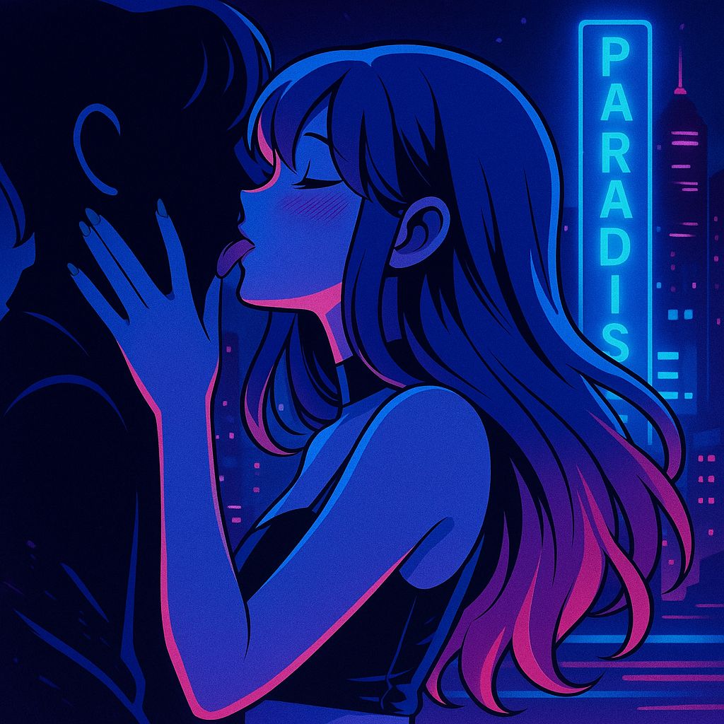 Electro Rock + Shoegaze hybrid, Breakbeat-driven groove with deep, side-chained sub-bass, Distorted guitars form a wide wall-of-sound with long reverb and dreamy delay, Vocals are intimate, whispered, cool, ASMR-close, In the chorus “MELT MELT MELT, ” guitars bloom into noise and blue-tinted ambience, like neon melting through the city, Hypnotic looping strings remain as the anchor while brass and vibraphone float lightly above, Bridge becomes chaotic with fuzzy guitars and scattered FX, then snaps back into a powerful drop, Overall tone: urban, dreamy, intoxicating, like two bodies dissolving into light, female vocals
