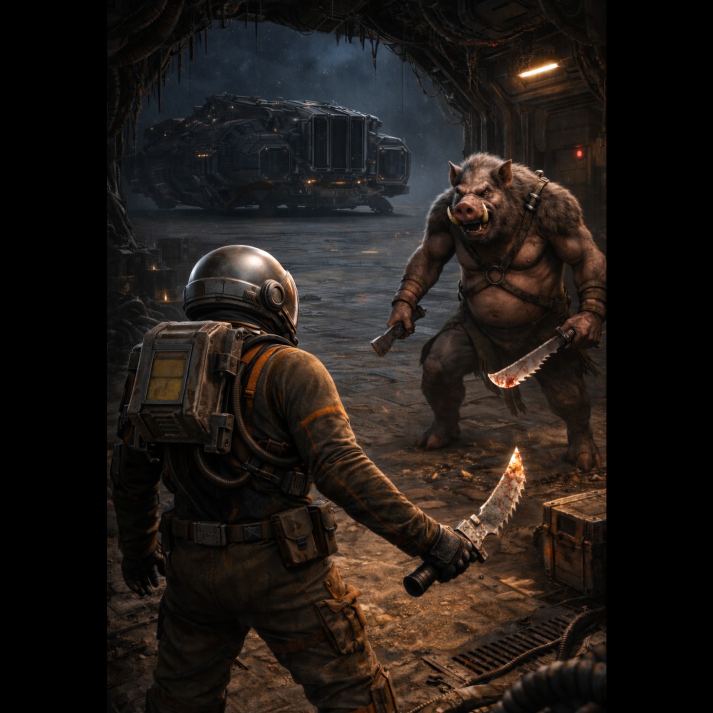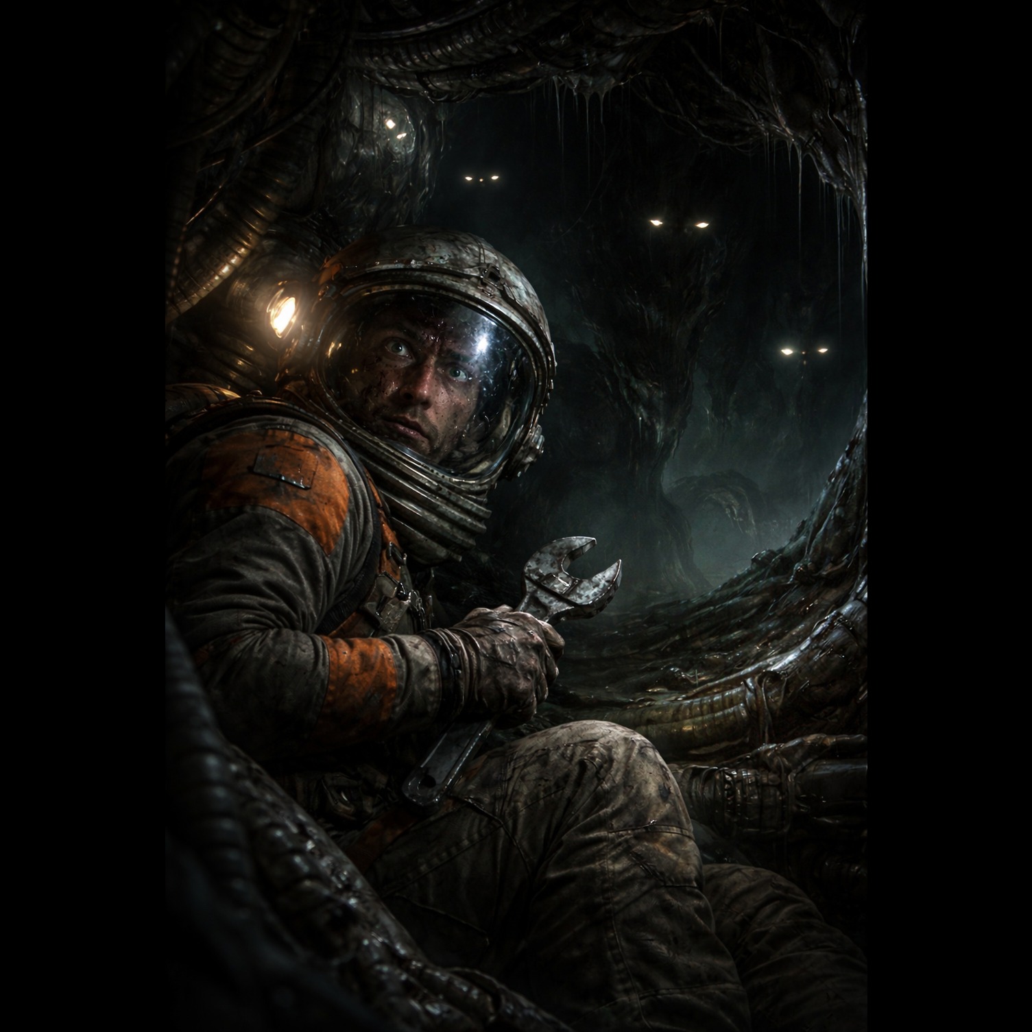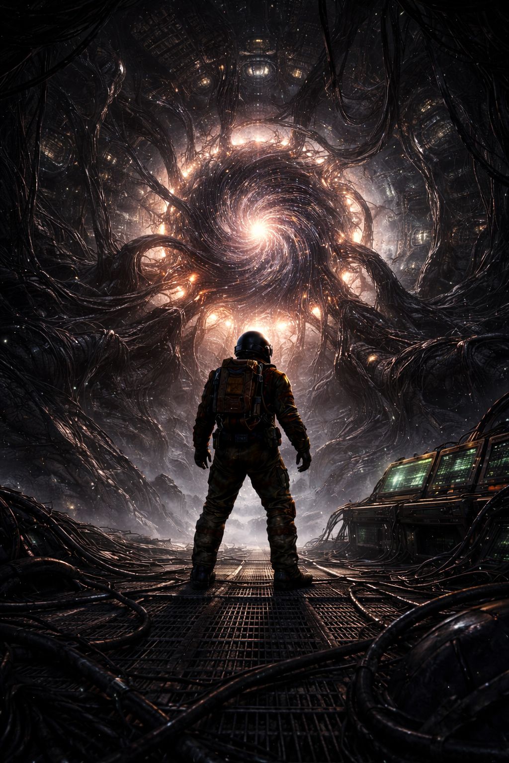 surreal sci-fi inspired progressive doom metal behind a eerie and visceral post-industrial grunge melody that builds tension without release, bridges are performed with deep growling vocals