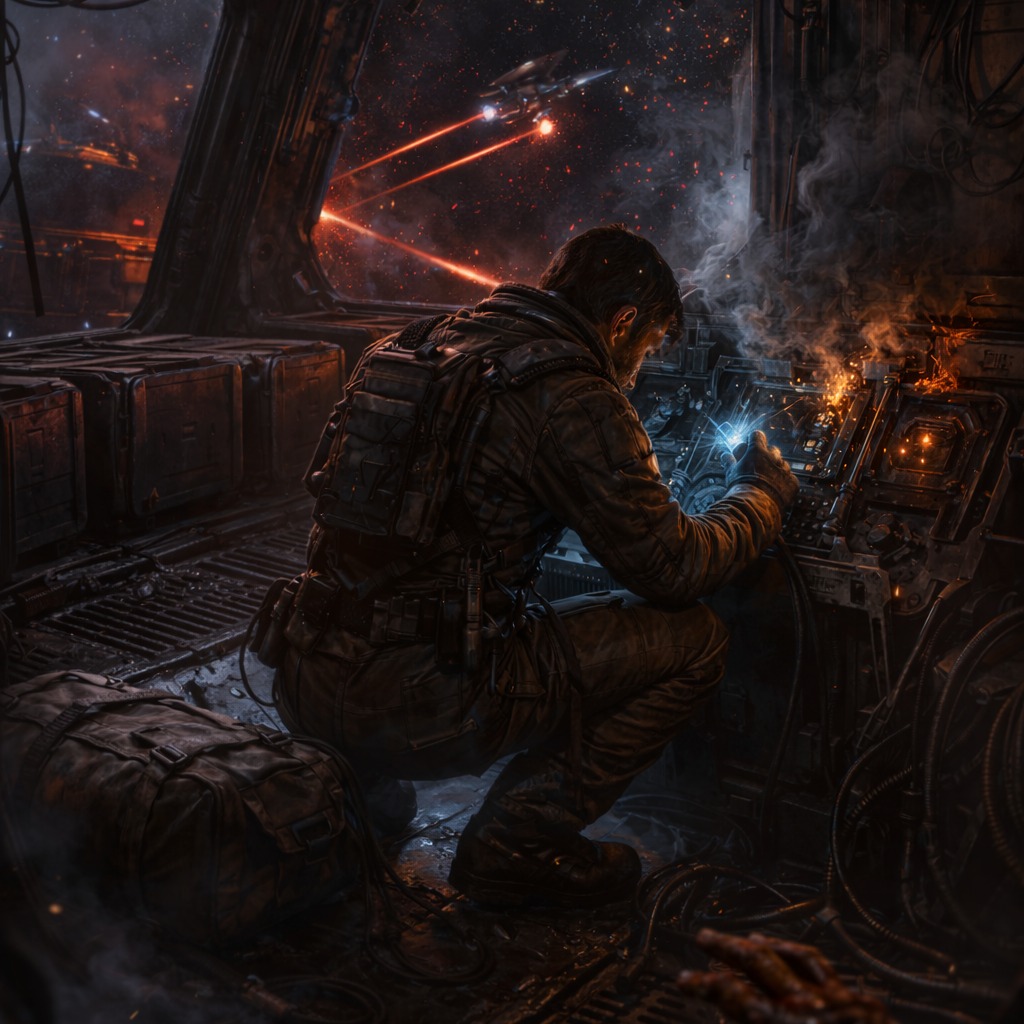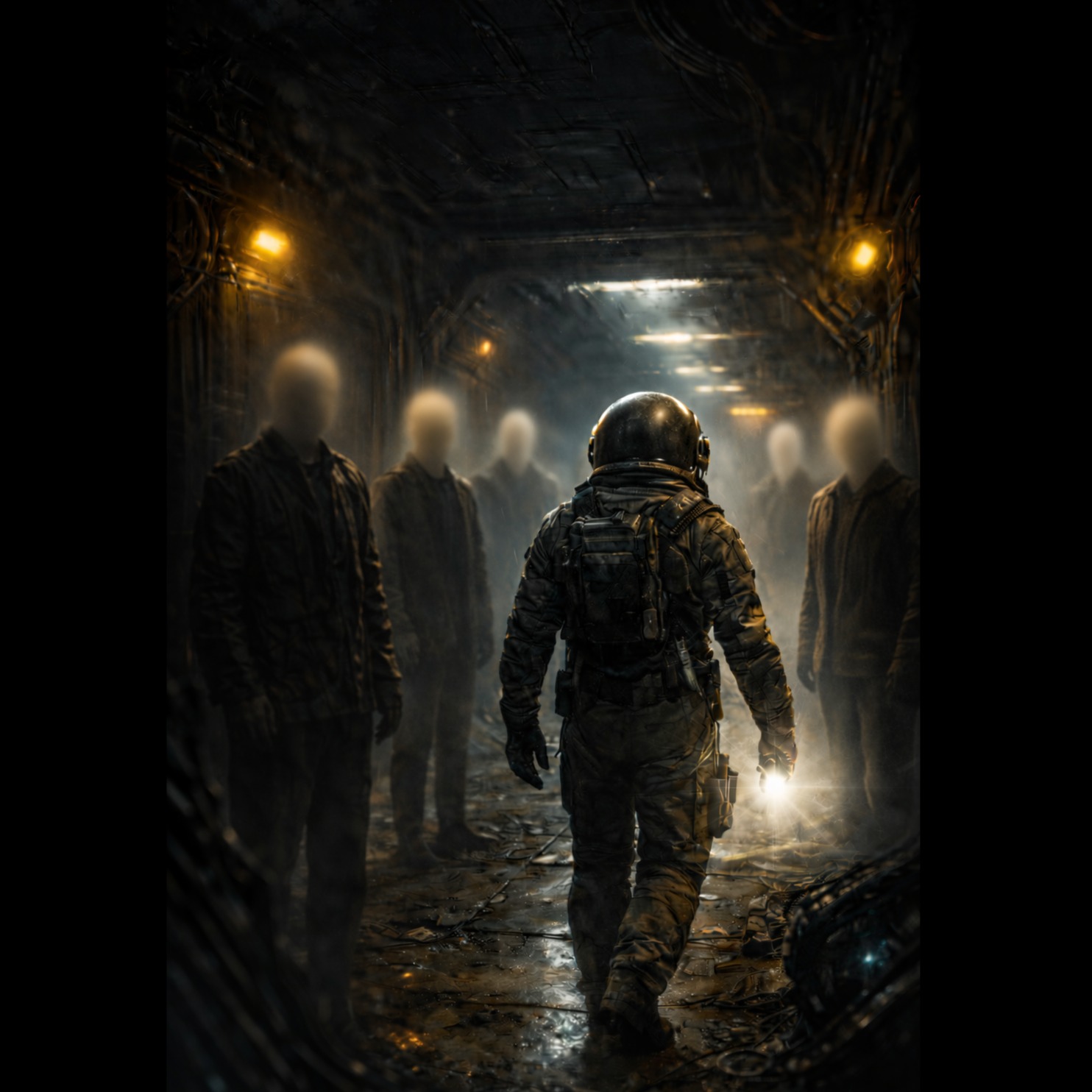 progressive industrial tech-nu metal with a chilling sci-fi inspired ambient background, emotionally expressive and clean male vocals, nasal resonance and falsetto vocals