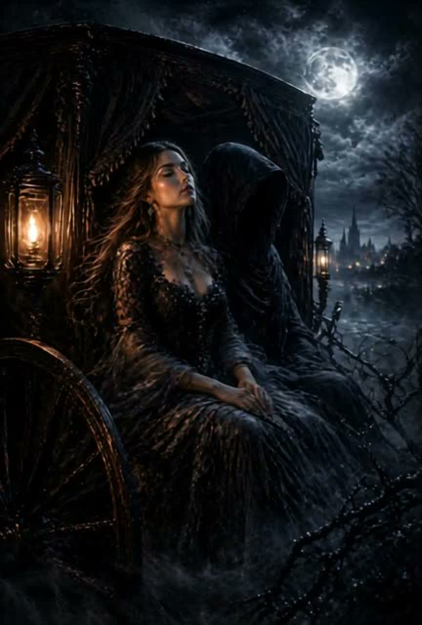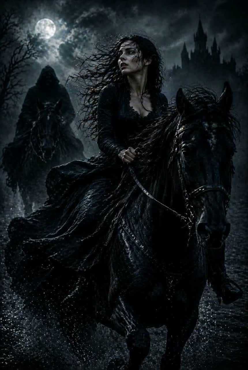 Dark Cinematic Folk × Gothic Ballad × Ritual Ride, 90 BPM, FEMALE LEAD ONLY, CLEAR SOLO VOICE, Vocal: emotional, intense, expressive, rising from fragile to powerful, Atmosphere: night ride, wind, urgency, tragic love, supernatural tension, Instruments: driving drums (galloping rhythm), low strings, dark piano, cinematic hits, wind effects, subtle choir, Structure: Intro ambient, Verse calm, Pre build, Chorus strong, Verse darker, Chorus bigger, Bridge intense, Final Chorus epic, Outro fading, Production: cinematic, wide stereo, organic, no EDM, no pop, no autotune, dynamic, dramatic