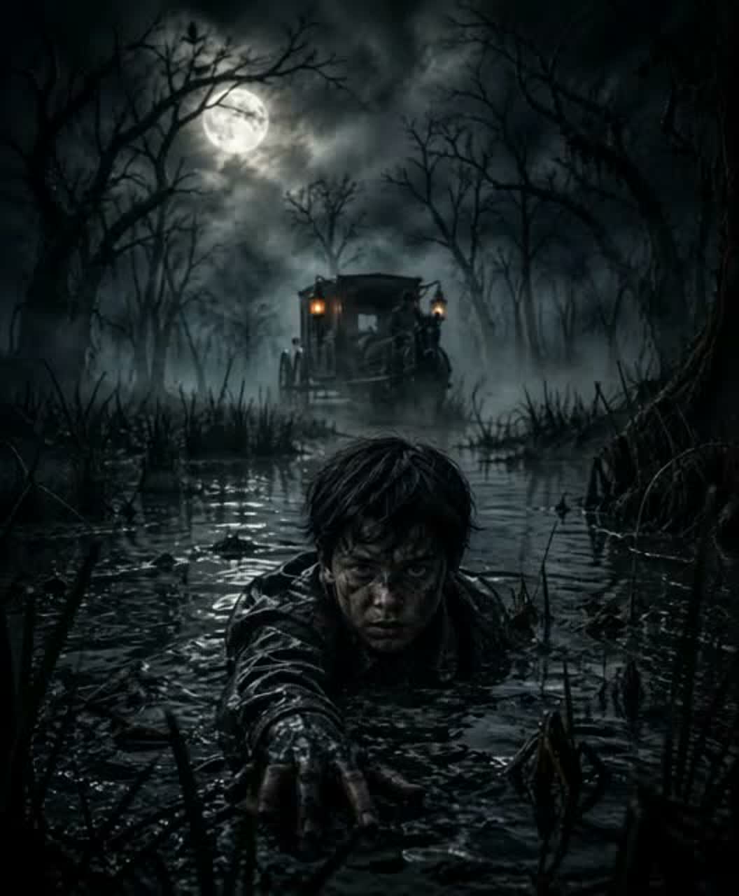 Dark Ritual Folk × Cinematic Horror Ambient × Gothic Folk, 75 BPM, DUET ONLY, STRICT ORDER, NO OVERLAP, CLEAR VOICE SEPARATION, Female: emotional, tense, fearful, intense, Male (Moor/voice): deep, calm, eerie, whispering, unsettling, Atmosphere: foggy swamp, night, dread, isolation, slow rising horror, Instruments: deep drums (heartbeat + heavy hits), low cello drones, dark strings, ambient pads, wind sounds, water textures, subtle choir whispers, Structure: Intro ambient, Verse female, Pre female, Chorus female, Verse male, Pre duet alternating, Chorus duet (separate lines), Bridge male whisper, Final Chorus female, Outro ambient, Theme: fear, being hunted by environment, losing control, Production: cinematic, dark, heavy low-end, organic, no EDM, no pop, no autotune, intense, haunting