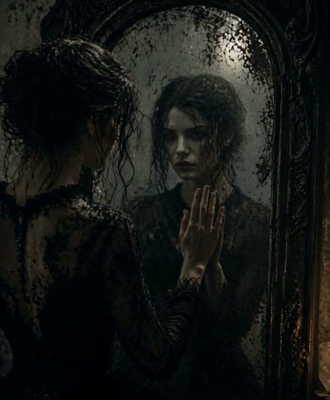 Dark Ambient × Minimal Piano × Psychological Gothic, 65 BPM, FEMALE SOLO ONLY, NO DUET, CLEAR SINGLE VOICE, Vocal: intimate, whispery, emotional, slightly unstable, controlled but haunting, Atmosphere: mirror, identity, subtle horror, inner conflict, silence tension, Instruments: minimal piano notes, soft glass-like sounds, low drones, ambient pads, no heavy drums, very subtle pulse, Structure: intro ambient, verse calm, pre subtle lift, chorus emotional but restrained, bridge spoken minimal, final chorus deeper, outro fading, Production: cinematic, close, cold, reverb tails, no EDM, no pop, no autotune, Theme: self-reflection, двой identity, psychological unease