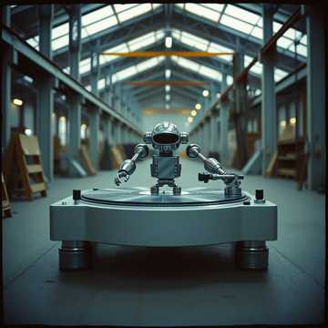 Hard Detroit techno foundation fused with hip-hop turntablism, Clean 4/4 kick pulse with 808 sub-bass, metallic percussion, and crisp snares, Layered record-scratch FX (chirps, flares, baby scratches, backspins) performed rhythmically over the beat, Robotic vocoder ad-libs punctuate transitions, Textures: cold chrome surfaces, urban warehouse reverb, mechanical energy, Tempo β 122 BPM, Mood: raw, underground, technical, confident