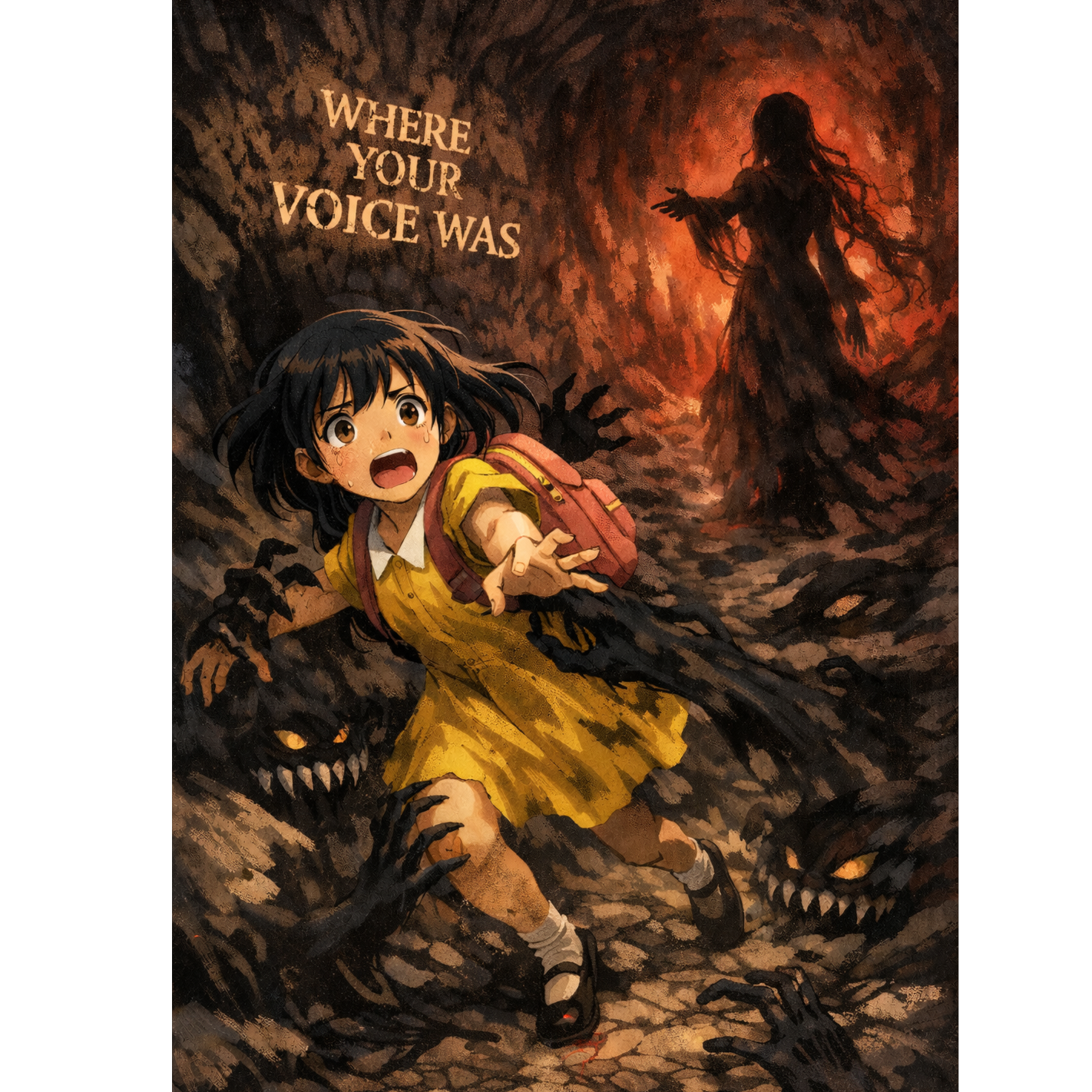 kawaii goth dark underground cavern horror song female vocal fragile terrified intimate claustrophobic same emotional texture as Round and Down world bends pulls and resists girl is only living being in land of the dead shadows grab and slow her imitation of Anna whispers come to me you are safe with me false comfort growing closer dread and panic escalating girl sobbing while running fear and pity overwhelming staccato phrasing in verses for panic dragging dread in choruses final chorus reveals real Anna presence and safety clear articulation every word sung including intro whispered ghostly lines behind main vocal cinematic darkness oppressive atmosphere slightly detuned emotional pressure