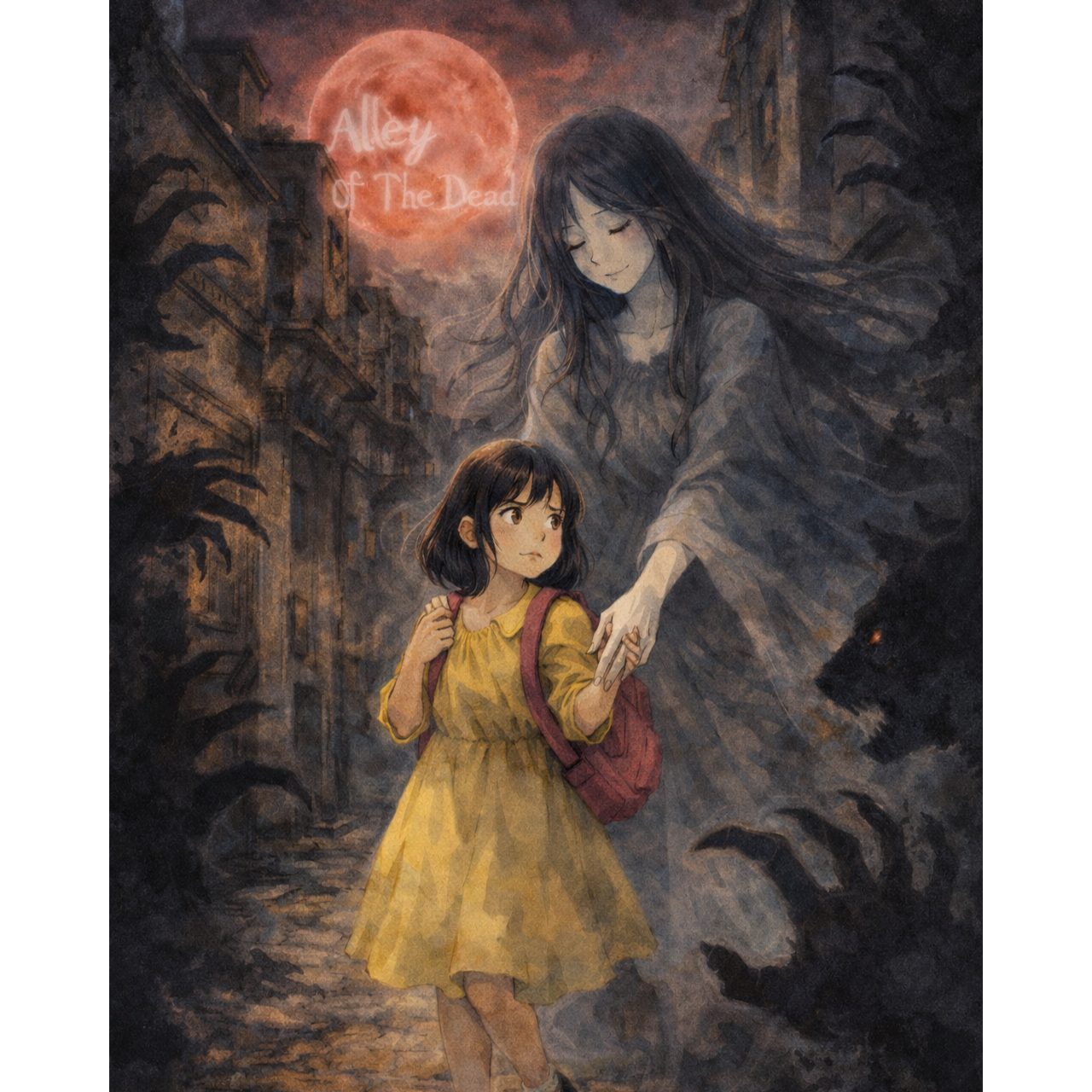 kawaii goth dark horror land of the dead song female vocal fragile eerie intimate slow tempo mechanical pull and push feeling world drags forward then snaps back descending tension minor unease fracturing brittle atmosphere filling space ghostly presence whispers of protective female spirit named Anna guiding the only living child clear articulation every word sung including intro emotional fear and relief cinematic darkness same texture and mood as Round and Down but more horror
