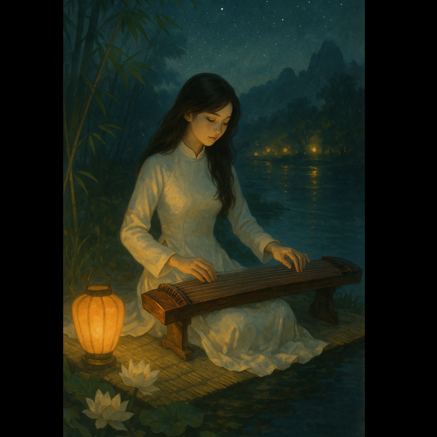 Male vocal, warm baritone, gentle and slightly raspy, poetic and emotional, like whispering across mountains and rivers, Inspired by traditional Asian ballads and romantic folk storytelling, Main instruments: đàn tranh (Vietnamese zither), bamboo flute, acoustic guitar, cello