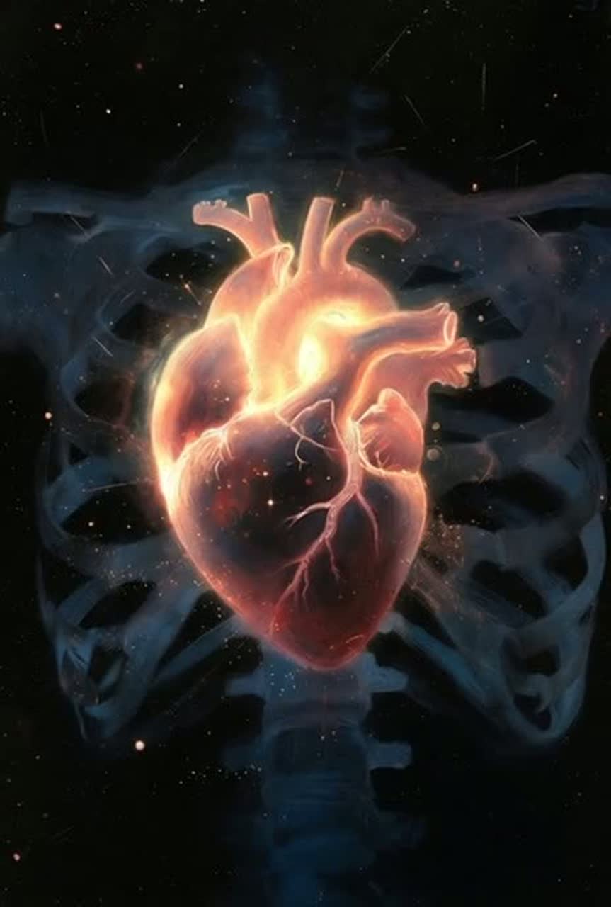 Ethereal synth pad, pulsing heartbeat, distant metallic clangs, clean delayed guitar arpeggios