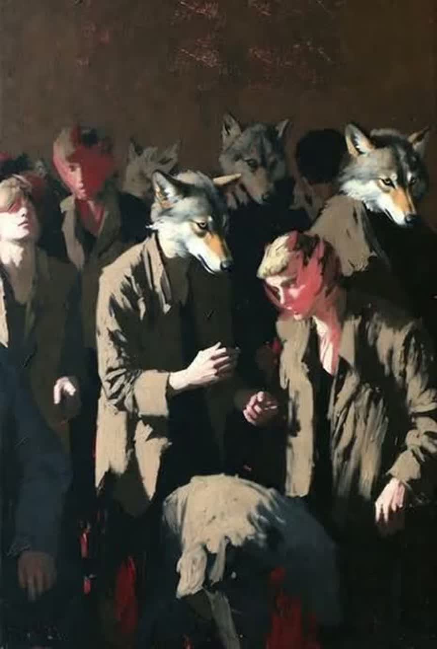(Heavy tom breakdown; chug guitars; echoing screams; minor-6th harmonies)