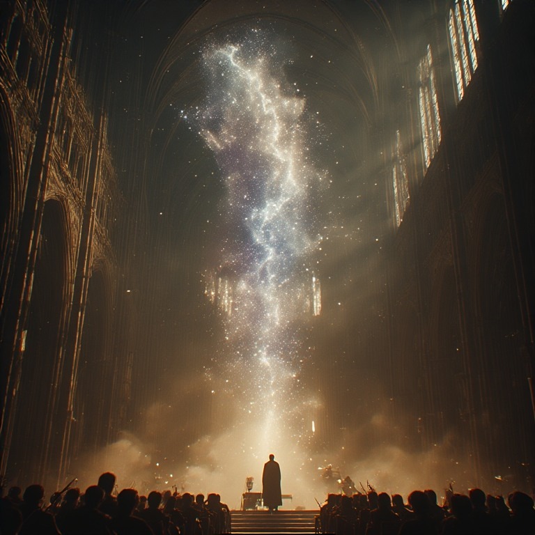 Full Philharmonic Orchestra, Cinematic Dub-Rock Fusion, 120 BPM, high dynamic range, Marimba solo, soulful operatic male vocals, soaring expressive female soprano solo (Great Gig style), emotional crescendo, lush tape echo, sacred atmosphere