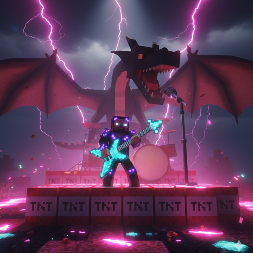 "Hard Rock, Heavy Metal, "Tenacious D - Master Exploder" style, operatic male vocals, energy, shredding electric guitar solos, heavy rock drums, 8-bit chiptune accents, heroic, manic, high-energy, cinematic rock, "