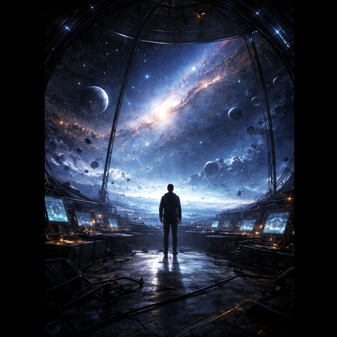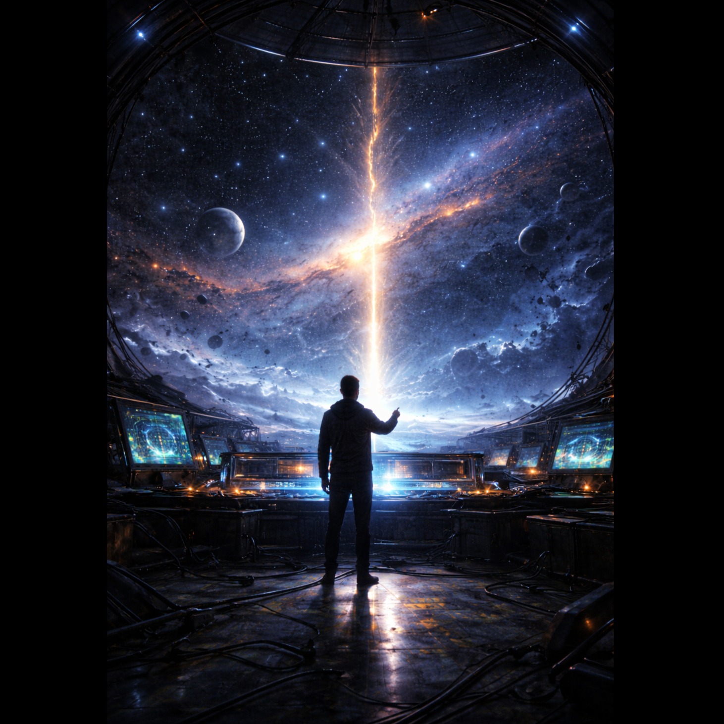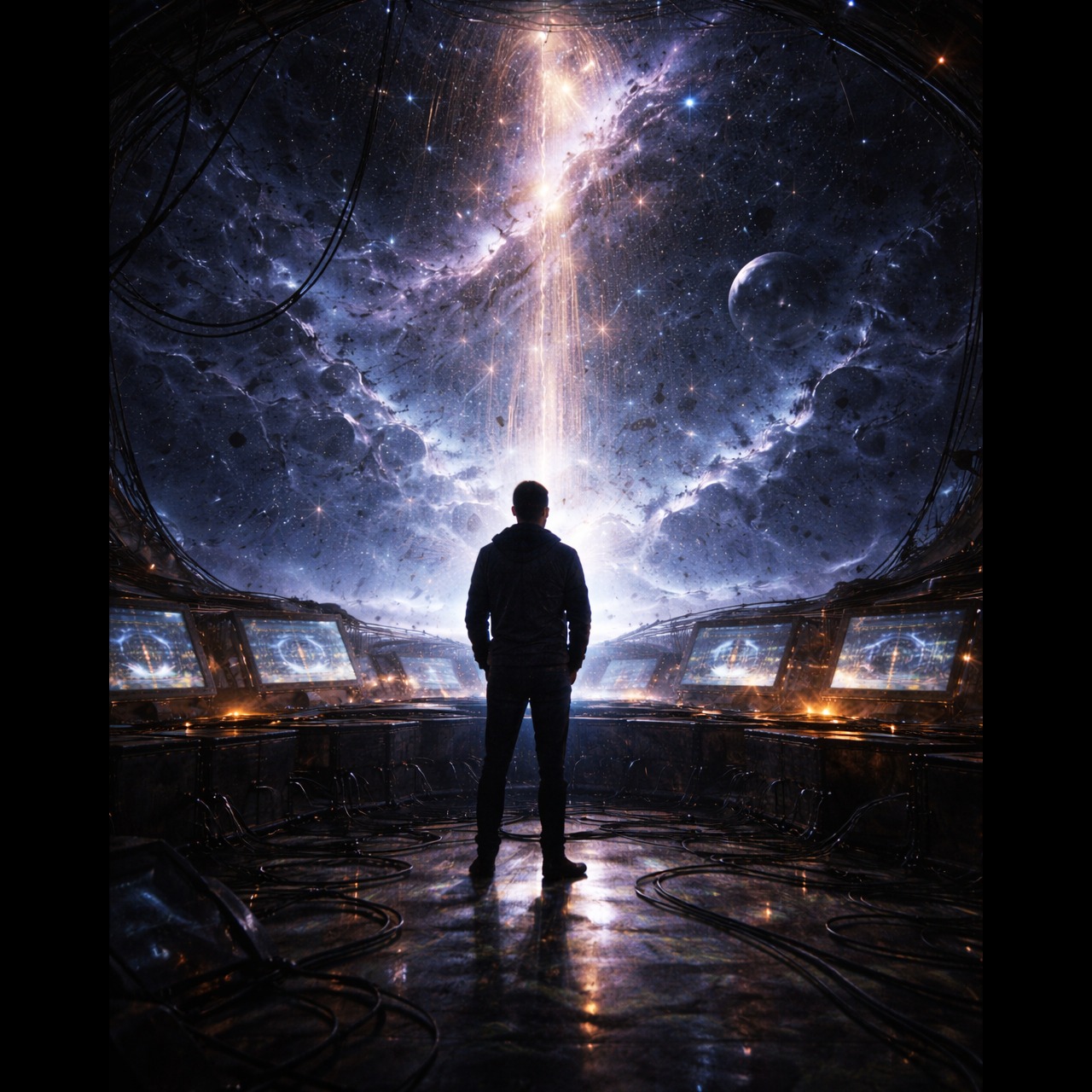 Genre: Epic progressive rock opera with cinematic sci-fi atmosphere, Vocals: Powerful male lead with expressive range and dramatic phrasing, ethereal female backing vocals (as distant voices), Instruments: Hammond organ, electric and acoustic guitars, flute, analog synths, double bass drums, melodic bassline, strings and choir pads, Mood: Mystical, intense, transcendent — blending beauty and danger, Structure: Ambient intro → strong rhythmic verses → soaring chorus → instrumental solos → spoken/sung bridge → climactic reprise → fading outro, Production: Wide stereo mix, deep reverb, layered harmonies, warm analog tone, dynamic tempo shifts, Theme: The mood is conflicted and emotional, capturing a moment where humanity debates shutting down a mysterious cosmic signal that seems to know their past