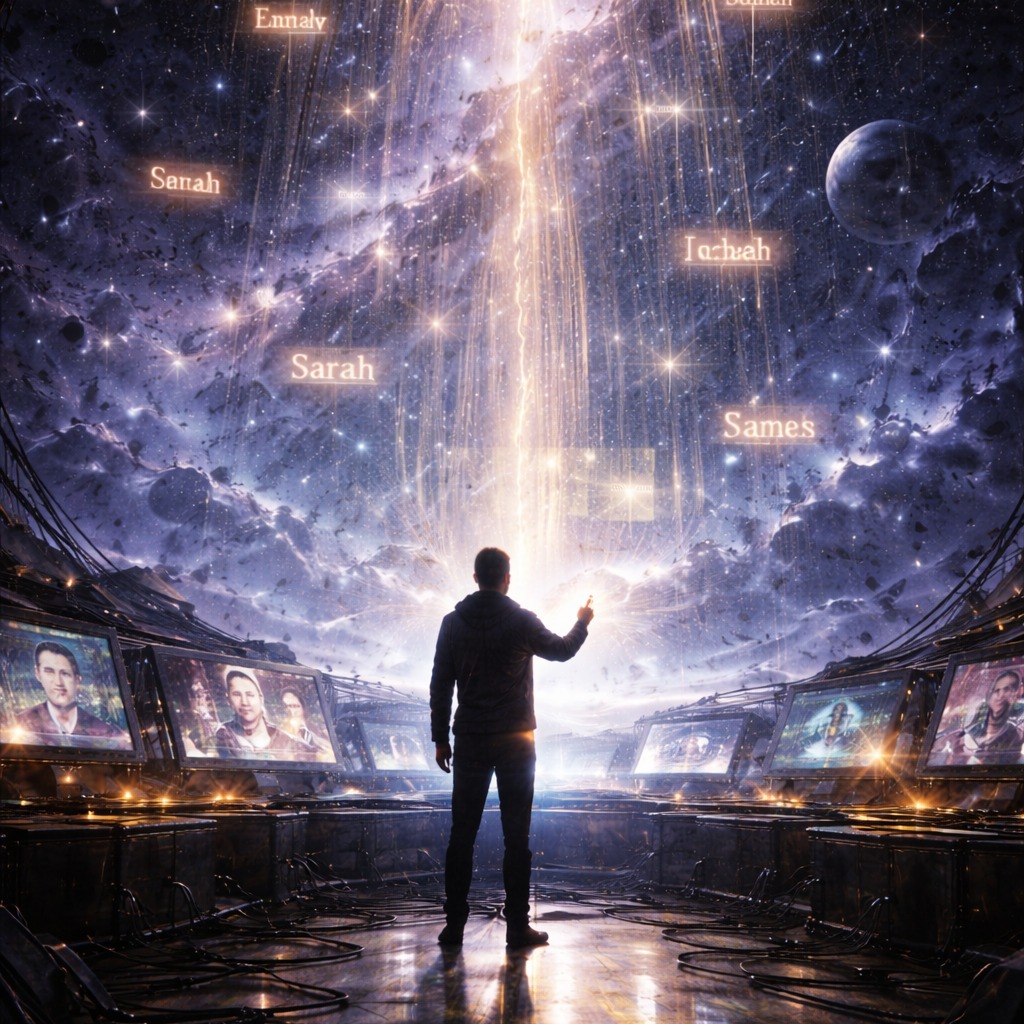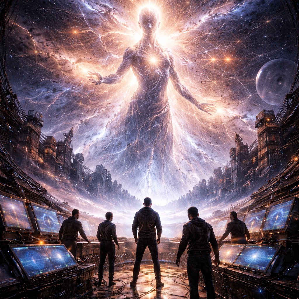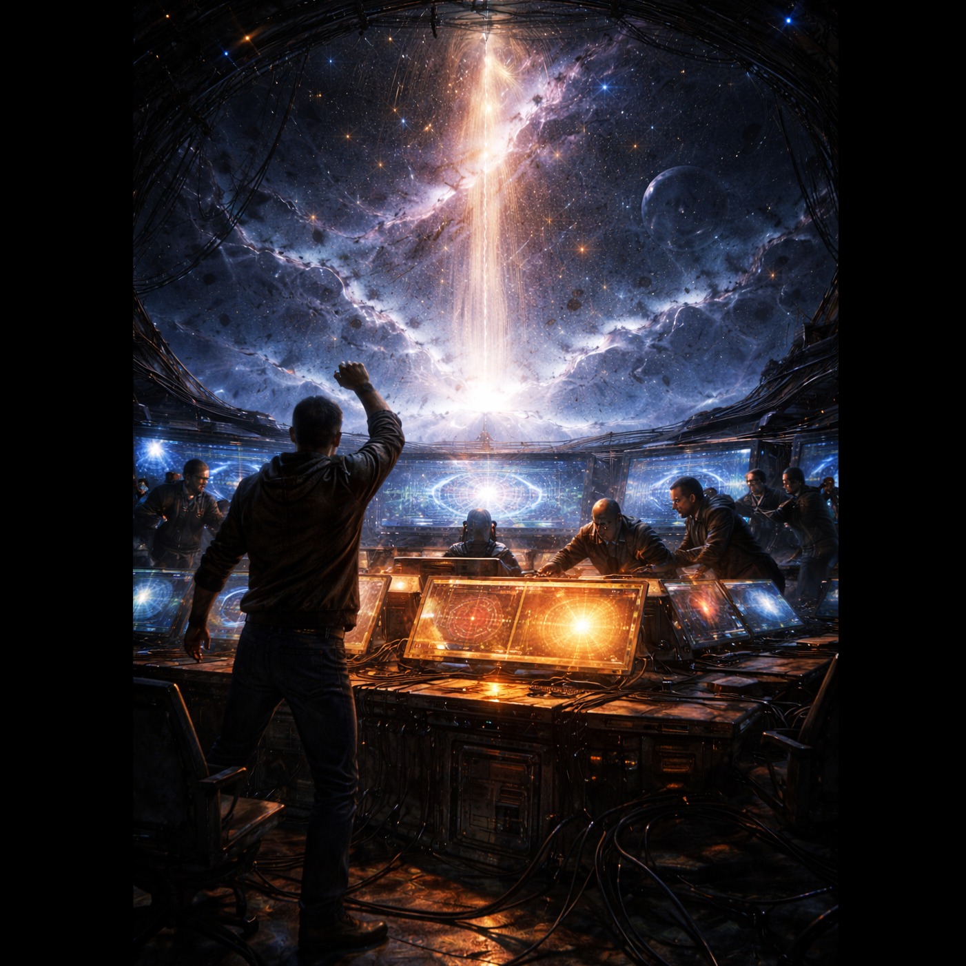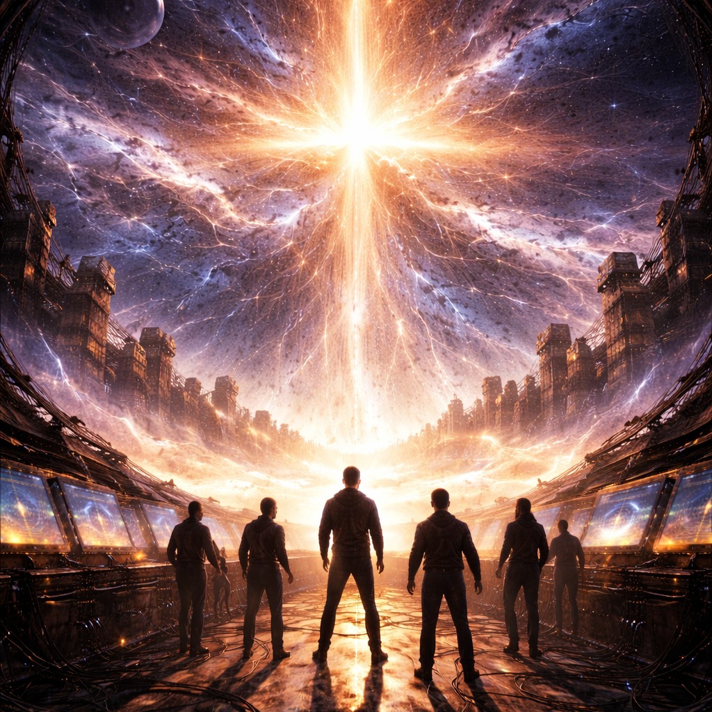 Epic progressive rock opera finale with cinematic sci-fi atmosphere, Powerful expressive male lead vocals with ethereal female backing vocals and choir layers, Instruments include Hammond organ, electric guitars, flute, analog synths, melodic bassline, orchestral strings and choir pads, The mood is hopeful, emotional and transcendent, representing humanity’s final decision after discovering the cosmic signal comes from their own future descendants, Structure: atmospheric intro → progressive verses → huge choir chorus → instrumental prog solos → uplifting final chorus → fading cosmic outro, Wide stereo mix, warm analog tone, deep reverb and dynamic tempo shifts