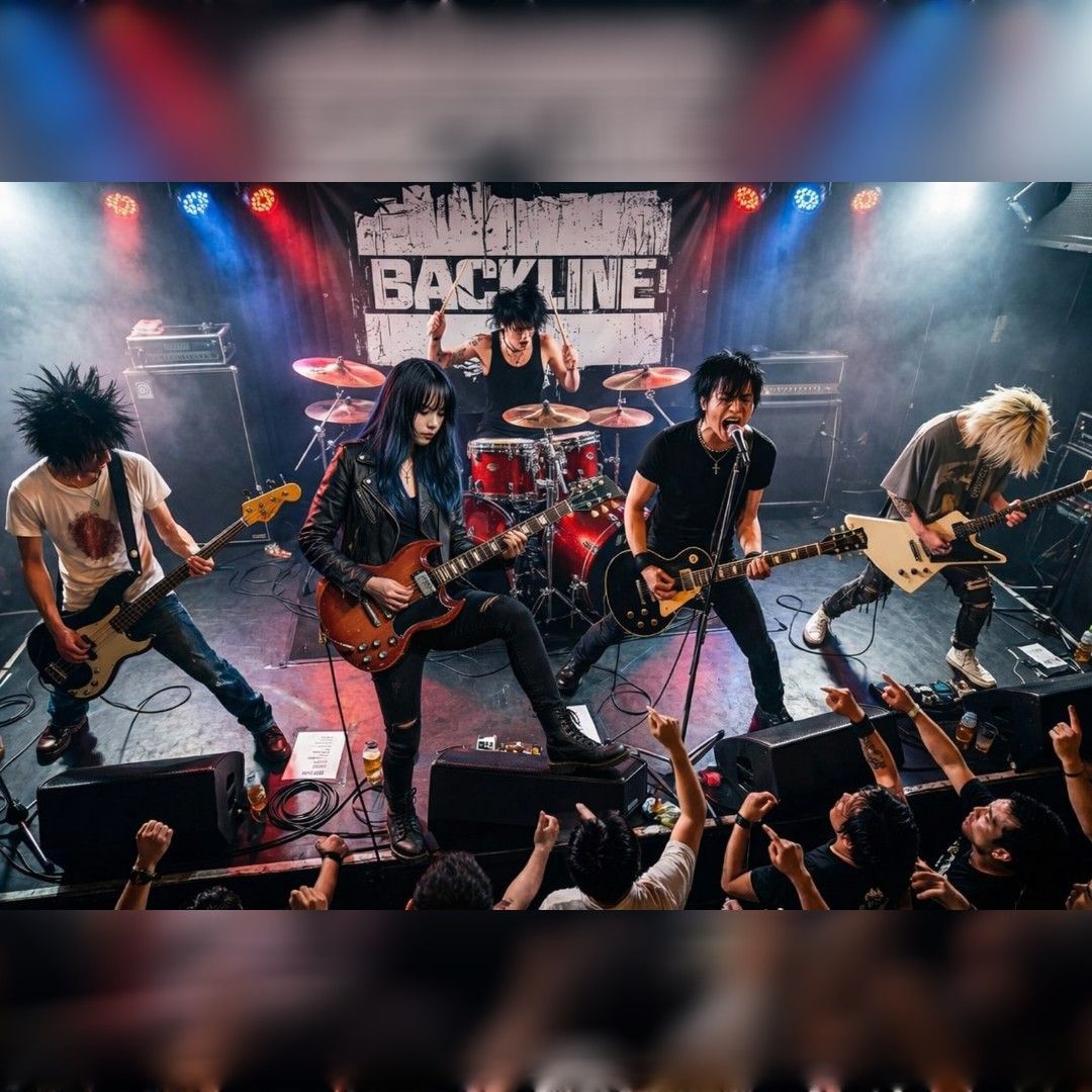 ROCK Live stage track, kawaii female vocal, Straight Rock, Melodic Hardcore, Create a groovy and mysterious funk-rock track performed by an all-girls band, J-Pop, J-Rock, DTM sound, Digital Rock, guitar, drum, bass