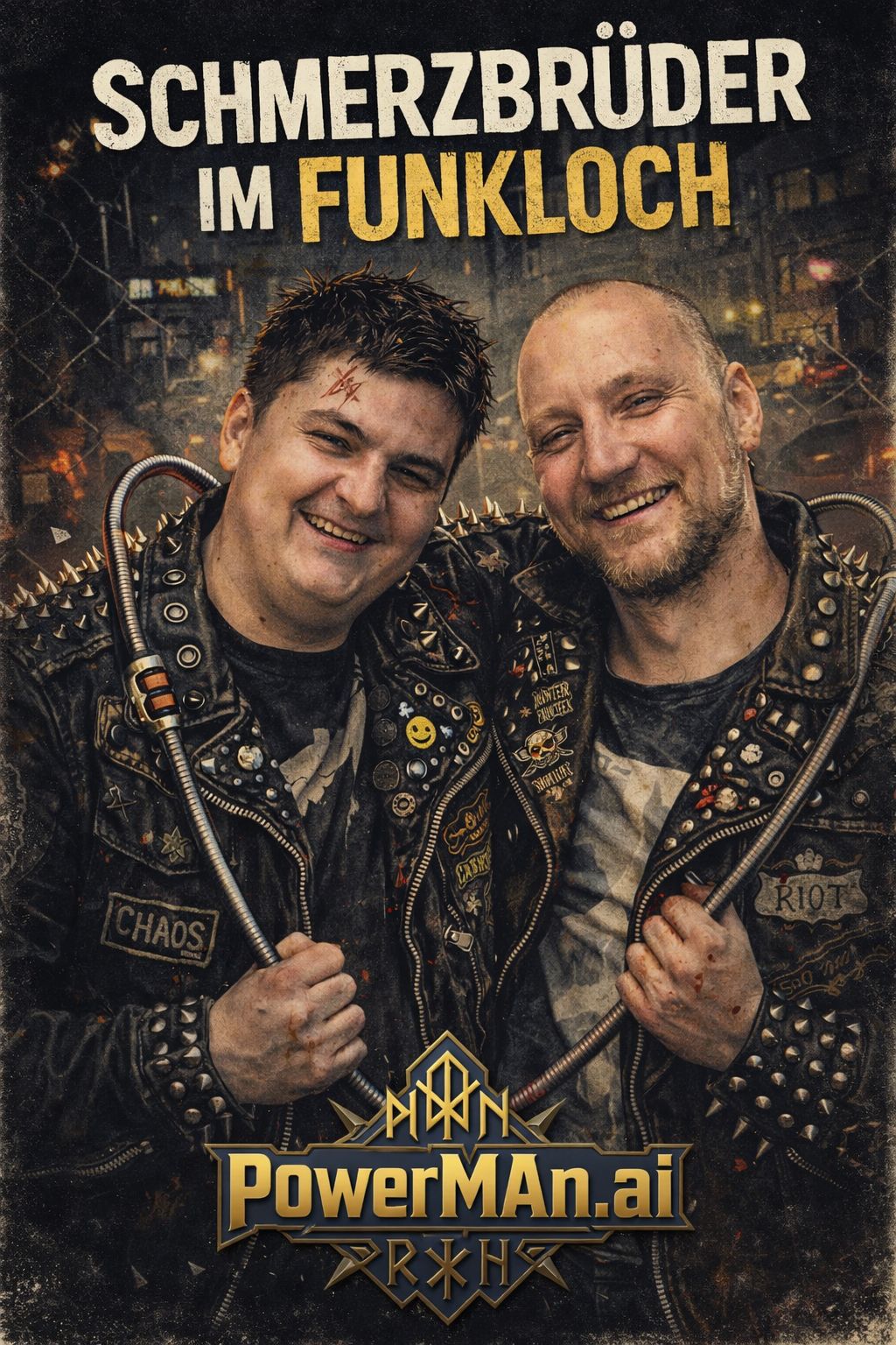 Punk-rock track, German lyrics, fast tempo, raw male vocals with slight rasp and irony, Story about two friends (“Schmerzbrüder”) in a surreal, chaotic situation with subtle hints of physical struggle (metaphorical “weight on the back”, “cable in the back”), lack of communication (“no signal”, “radio silence”) and absurd circumstances, Focus on dark humor, friendship, resilience and moving forward despite obstacles, Avoid explicit references to medical topics or real institutions, Sound: distorted guitars, energetic drums, driving bass, Optional SFX: [beeping rhythm], [radio static], Structure: intro, verses, pre-chorus, chorus, bridge, outro, Style inspired by German punk rock energy