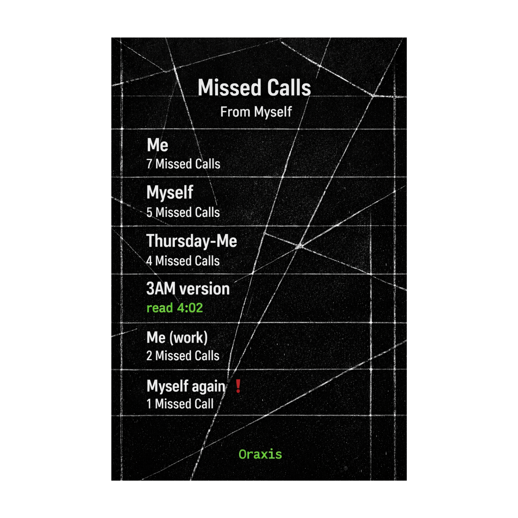 Glitch-Trap Spoken Word, Math Rock Rhythms, 142bpm, A minor, Erratic jazz-influenced hi-hats, manic not fast, time signature instability (7/8 into 4/4), 808s cutting in and out unpredictably, urgent stream-of-consciousness delivery, polyrhythmic drums against straight bass, analog synth stabs harsh and sudden, minimal reverb (dry anxious proximity), phone notification samples as percussion, typing sounds in texture, bitcrushed vocal doubles phasing in/out, no smooth transitions just hard cuts, controlled chaos structured underneath, tight compression creating claustrophobic urgency, impulsive forward momentum