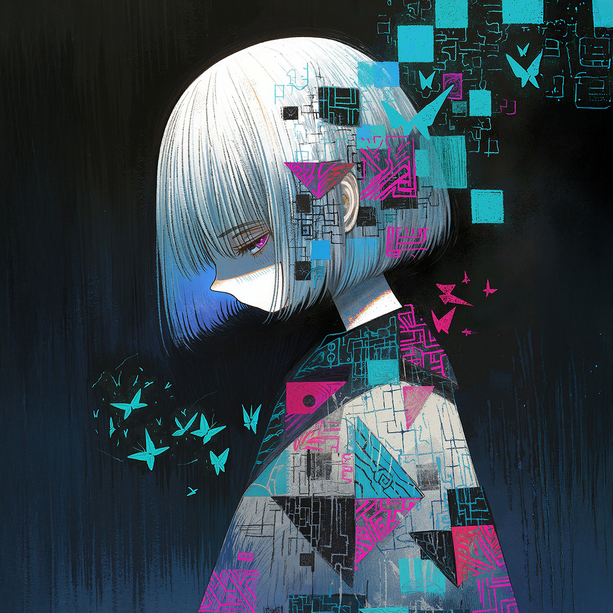 Glitchy Future Core, Hyper-Pop, High-BPM Kawaii Bass, Bitcrushed Synths, Complex Polyrhythmic Percussion, Rapid-fire Rap, Extreme Vocal Fry, Emotional Staccato, Micro-tonal Shifting, Jazz Fusion Chords, Odd Time Signatures, ‑Acoustic, ‑Generic J-POP, ‑Slow, ‑Lo-fi, ‑Simple melody, ‑Standard 4/4 time, ‑Calm, ‑Natural vocals, ‑Ordinary, ‑Safe chords