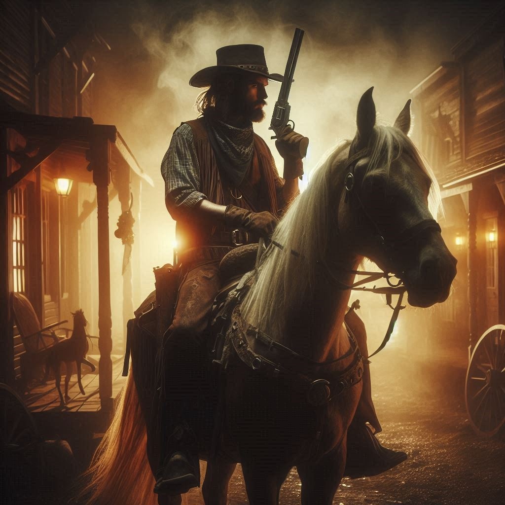 Intermittent guitar riffs, whistling, western metal, western hard rock