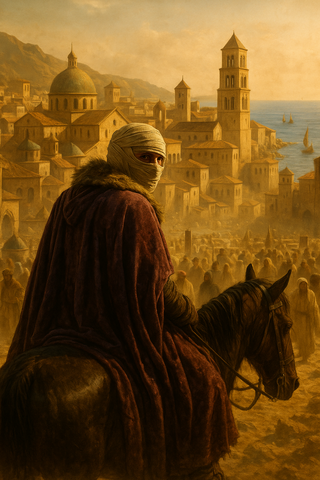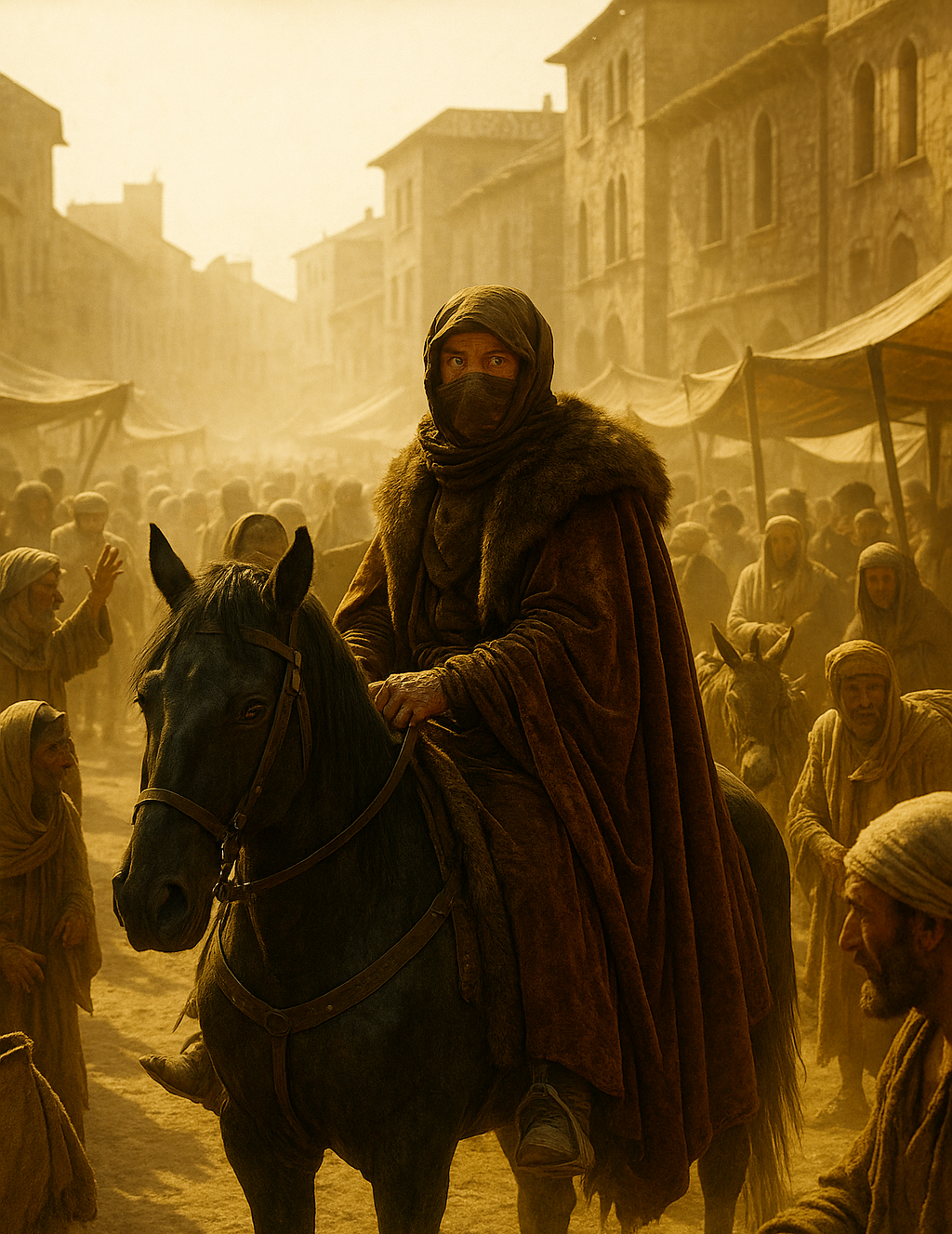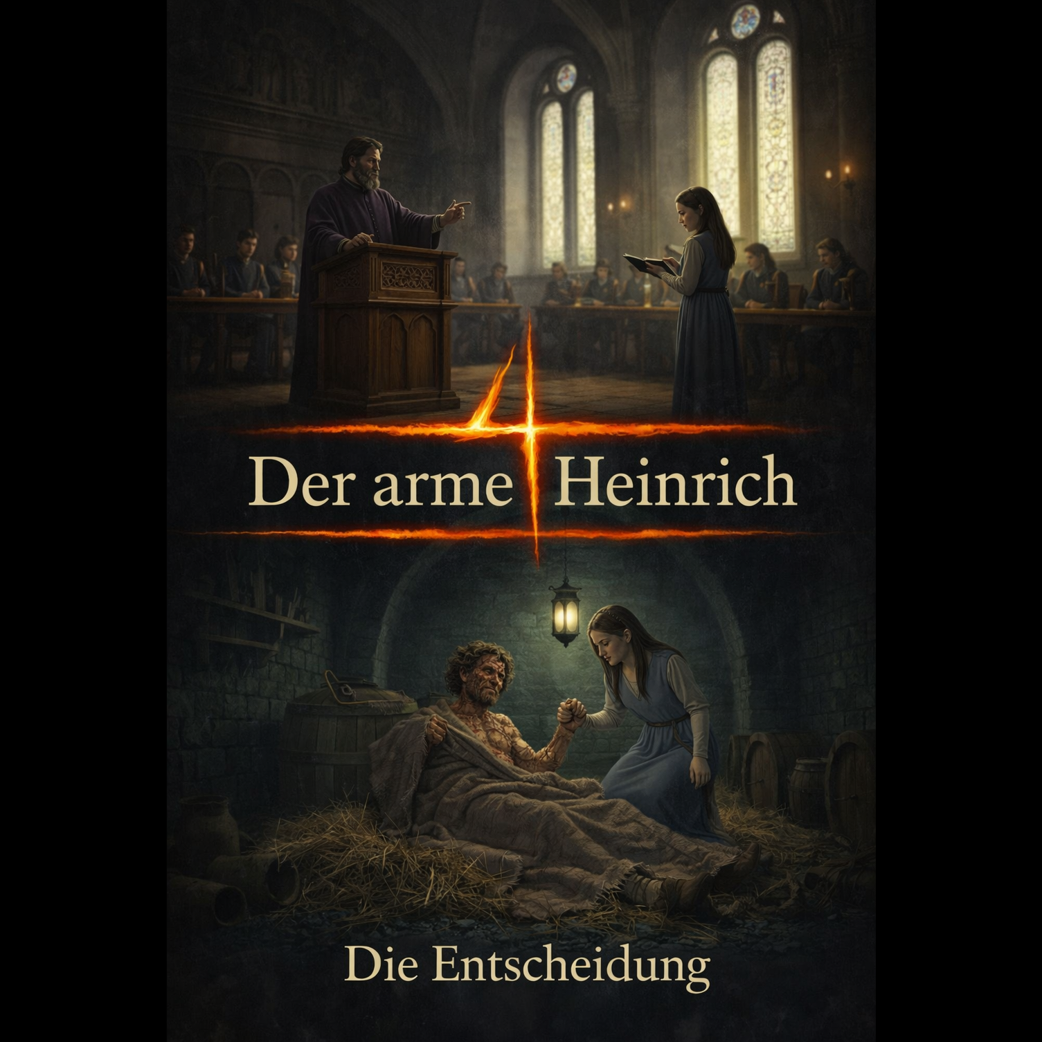 The piece is a dramatic, narrative-driven orchestral and folk composition with a strong medieval influence, It features a male narrator with a deep, resonant voice, speaking in German, The instrumentation includes a prominent string section, particularly violins and cellos, playing sustained chords and melodic lines that evoke a sense of grandeur and melancholy, A plucked string instrument, possibly a lute or mandolin, provides a rhythmic and melodic counterpoint, Percussion is used sparingly but effectively, with deep, resonant drums emphasizing dramatic moments, The tempo is slow and deliberate, building tension, The harmony is primarily modal, contributing to the ancient feel, Production elements include a wide stereo image for the orchestral parts and a close, intimate feel for the narrator's voice, Reverb is used to create a sense of space and depth, The overall dynamic range is broad, moving from quiet, spoken passages to powerful, full orchestral swells, The piece is structured around the narrative, with musical motifs supporting the emotional arc of the story, The melody is often melancholic and soaring, carried by the strings, The key appears to be in a minor mode, enhancing the dramatic and somewhat somber tone