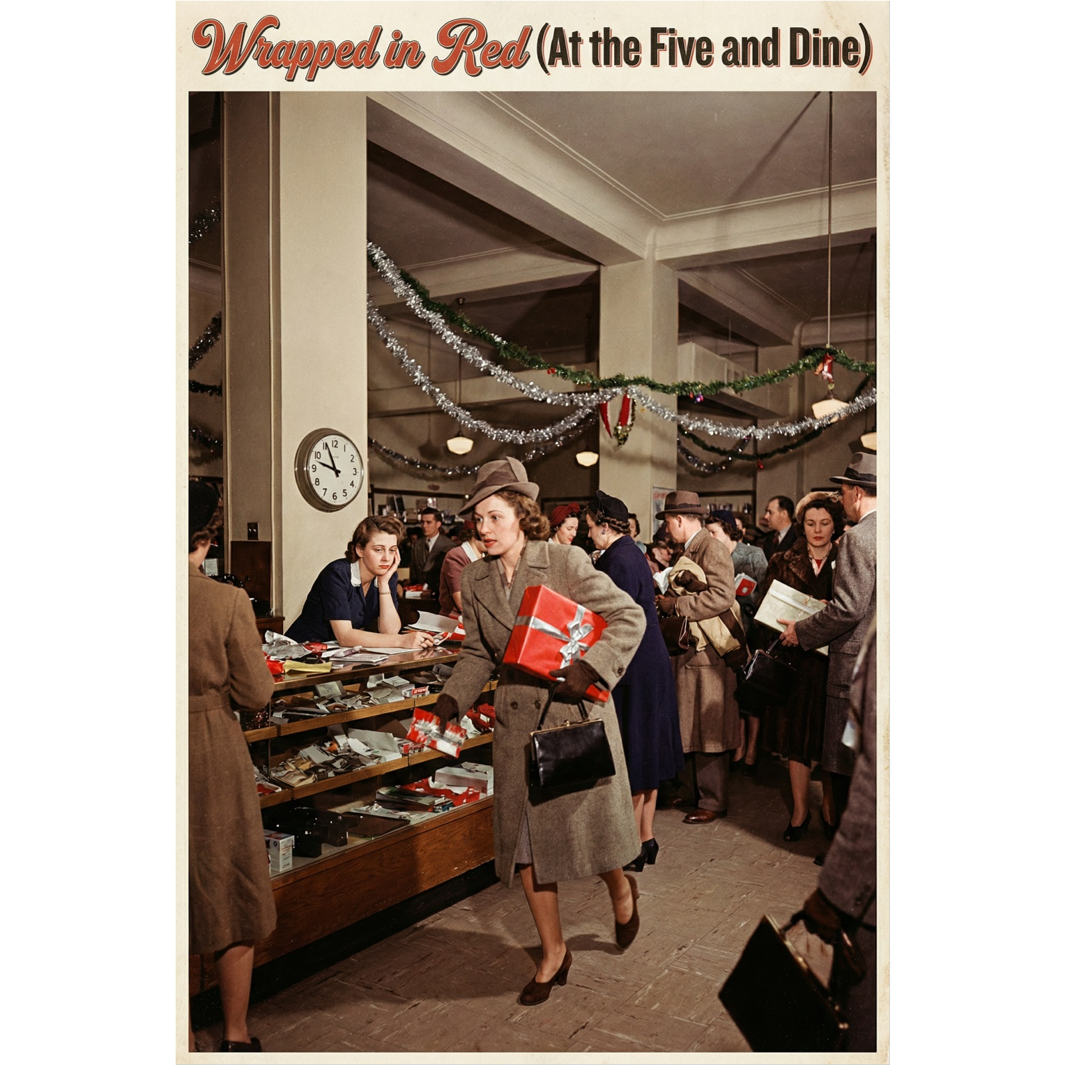 Upbeat 1940s Christmas swing with tight female close-harmony vocals in the style of classic vocal trios, Bright brass section, fast walking bass, jazzy piano, brushed drums, sleigh bells, and a lively department-store hustle mood, Energetic, fun, festive, with rapid-fire vocal interplay, vintage big-band flair, and a cinematic “last-minute holiday shopping chaos” atmosphere