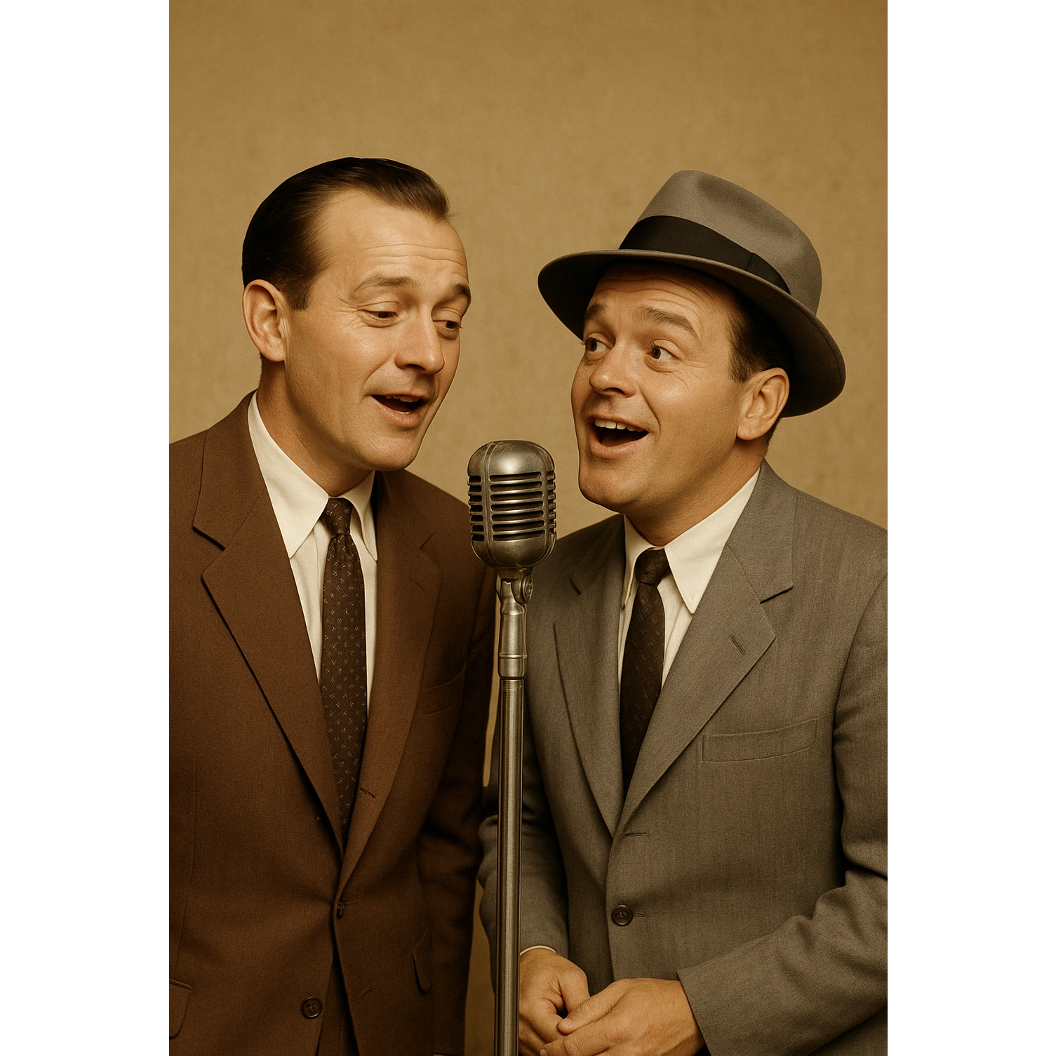 Playful 1940s swing male duet with light big band accompaniment, smooth crooning male vocals, witty back-and-forth banter, close harmony choruses, walking bass, muted brass hits, clarinet flourishes, gentle brush drums, warm and relaxed comedic delivery, Tempo: 96–102 BPM, Key: C Major, Two distinct male voices for Male 1 and Male 2, Occasional spoken interjections in a conversational tone