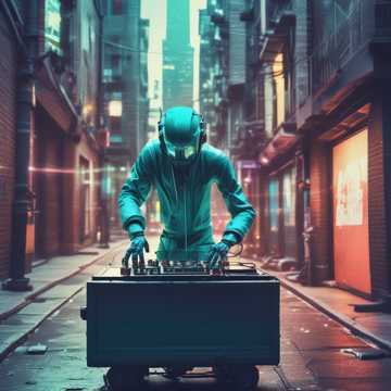 clicking and clattering mechanical percussion, buzzing electronic synth, traditional japanese instruments, trip-hop, lo-fi hip-hop, djent, bossa nova, turntable scratching, glitchy, programming, metalcore, old staticky samples, computer beeps and boops, mathcore, ambient, spacey, dubstep, dark, melancholic, sad