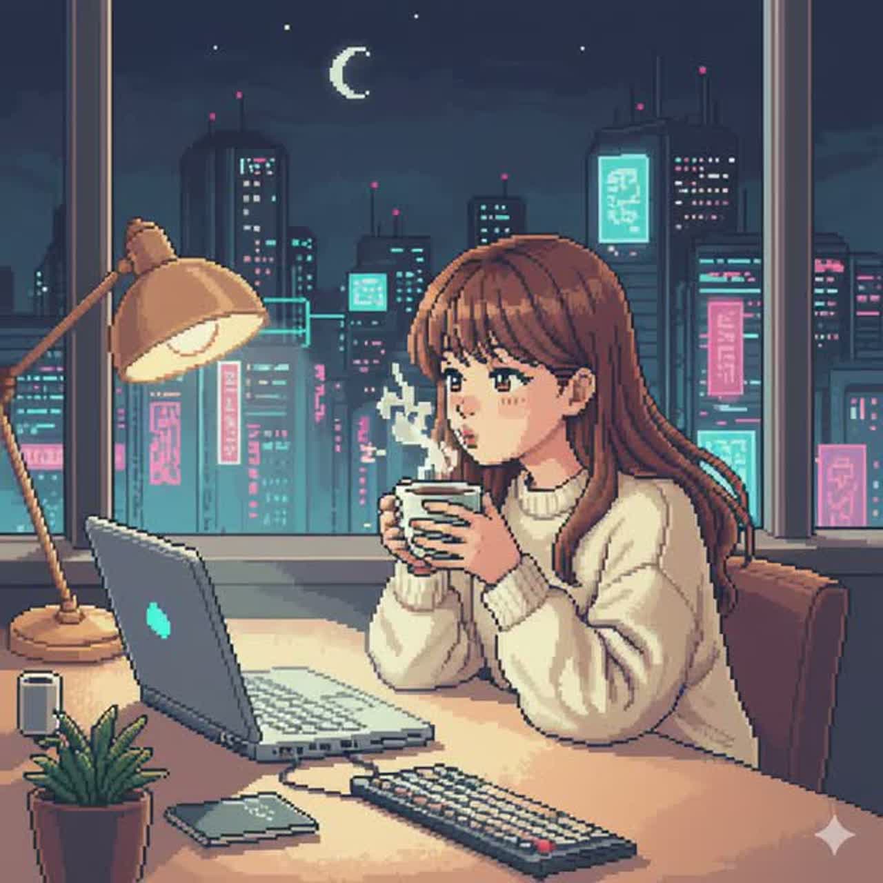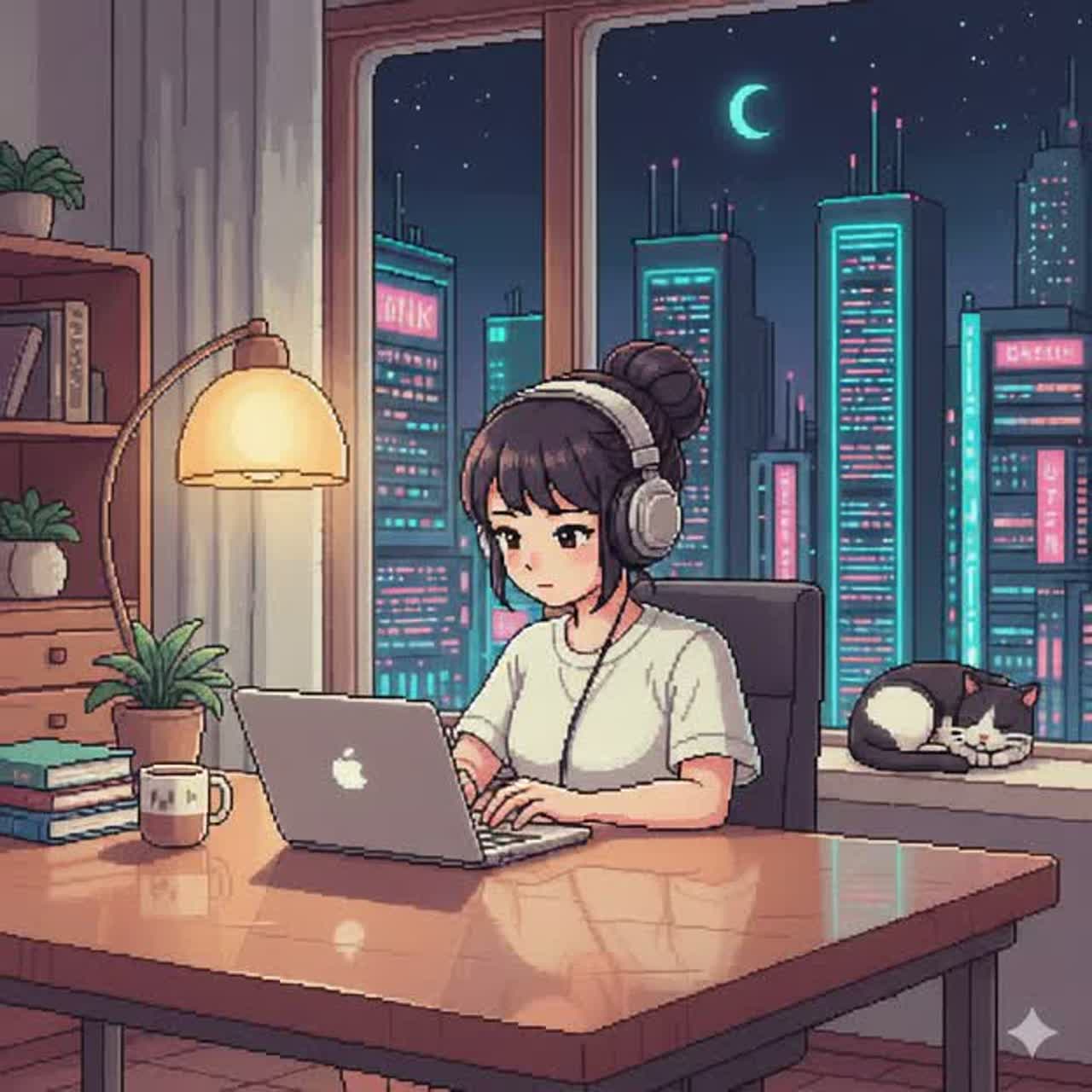 playing emotional chords with major 7th, minor 7th, and suspended tones, Smooth and gentle attack, Tempo around 74–76 BPM, Light chill pop rhythm with a soft pulse and gentle movement, No hip hop groove, No heavy bass, Bass should be warm and light, slightly more present than the first track, Wide airy pads and subtle reverb create a calm night atmosphere, Feels like late night slowly becoming easier to breathe, Feminine, soft, and introspective mood, Background music for night work, quiet thinking, and focus, Smooth loopable structure, Gentle fade in and fade out