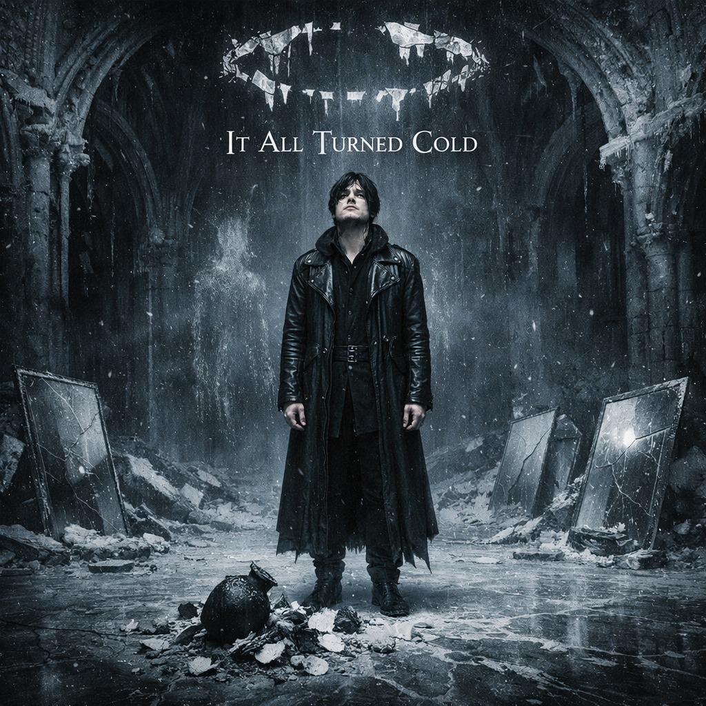 A dark fusion of classical music, dark pop, and cyber-gothic in D minor at 78 BPM, Cold synth pads, delayed clean guitar, and isolated piano open the song in near-frozen stillness, while strings carry the main mournful melody, The first chorus arrives like a slow glacier: heavy low electric-guitar chords, long cymbal tails, and dark brass swells make the weight feel physical, Verse two keeps the intimacy but adds restless bass motion and light guitar grit, The solo becomes the wordless cry, with electric guitar on the main melody, horns and trombones answering in counter-motion, and strings filling the air beneath, The bridge breaks into a harsher marching surge of rage before the final chorus blooms into tragic acceptance, Overall: crushing, intimate, elegiac, and cold, never uplifting
