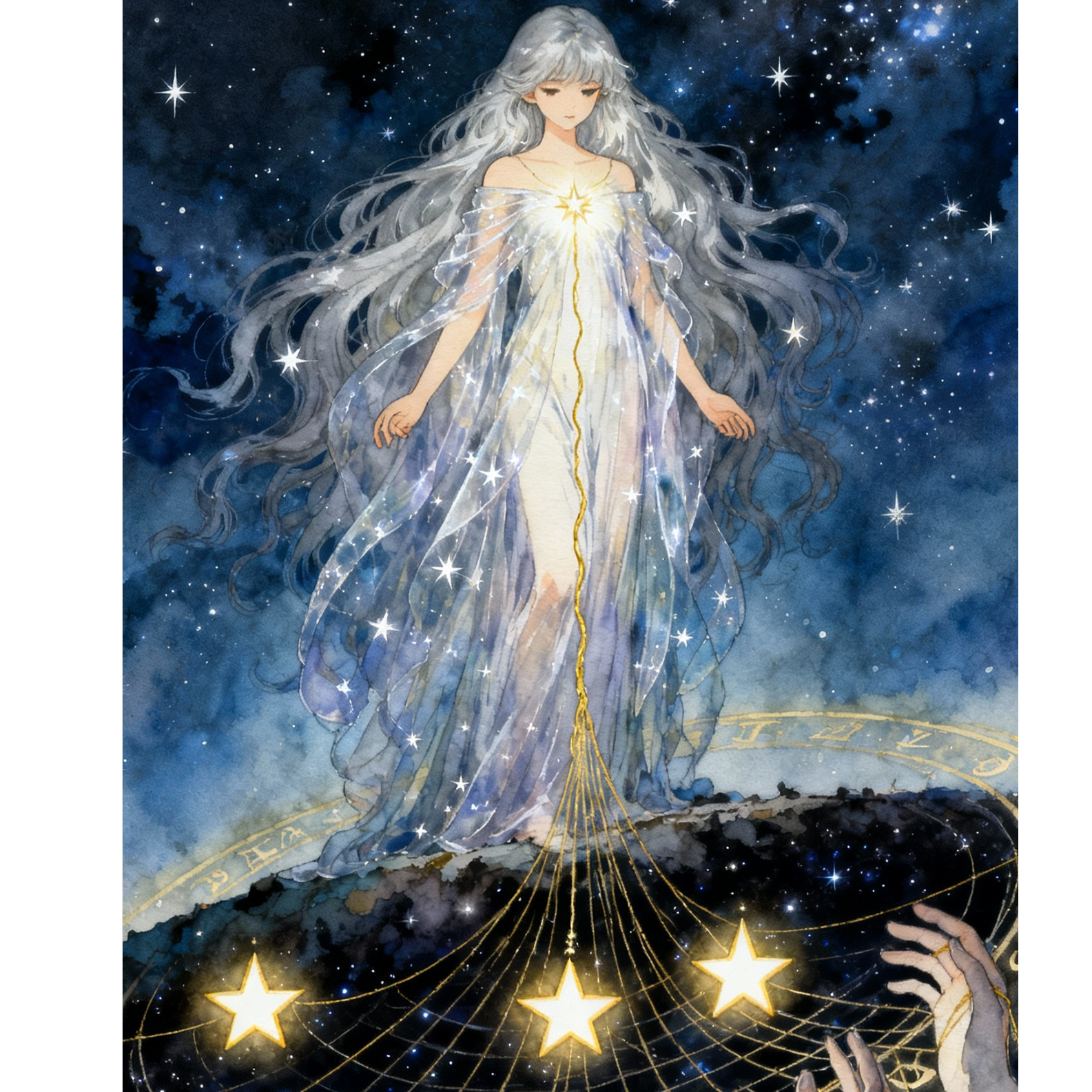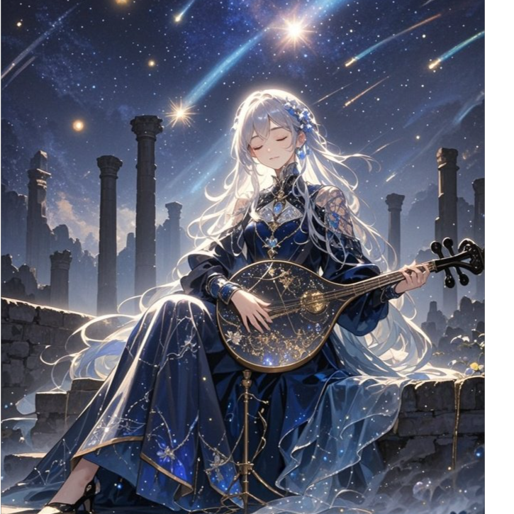 Celtic Fantasy × Japanese Fantasy Folk × Cinematic Mythopoetic Ballad × Ethereal Soundscape(BPM 110), A theatrical, five-act composition: ✦ Intro – reverse piano, wind drones, shimmering bells, and French whispers create a celestial prelude, ✦ Verse – soft harp, delicate strings, and subtle guqin/erhu accents with airy, prayer-like vocals, ✦ Chorus – luminous orchestration with choir, bodhrán, taiko, and radiant strings symbolizing destiny, ✦ Bridge – reverse tones, granular particles, heartbeat pulses, distant whispers, ✦ Finale – orchestral bloom fading into crystalline piano, Sound: ethereal and airy, long cathedral reverb, high-frequency shimmer, stereo depth, Use celesta, glass harp, music box for stardust ambiance, Vocals: breathy Japanese female, poetic phrasing, layered harmonies, French whispers, Mood: sacred, melancholic, transcendent — a hymn of naming, creation, and divine light