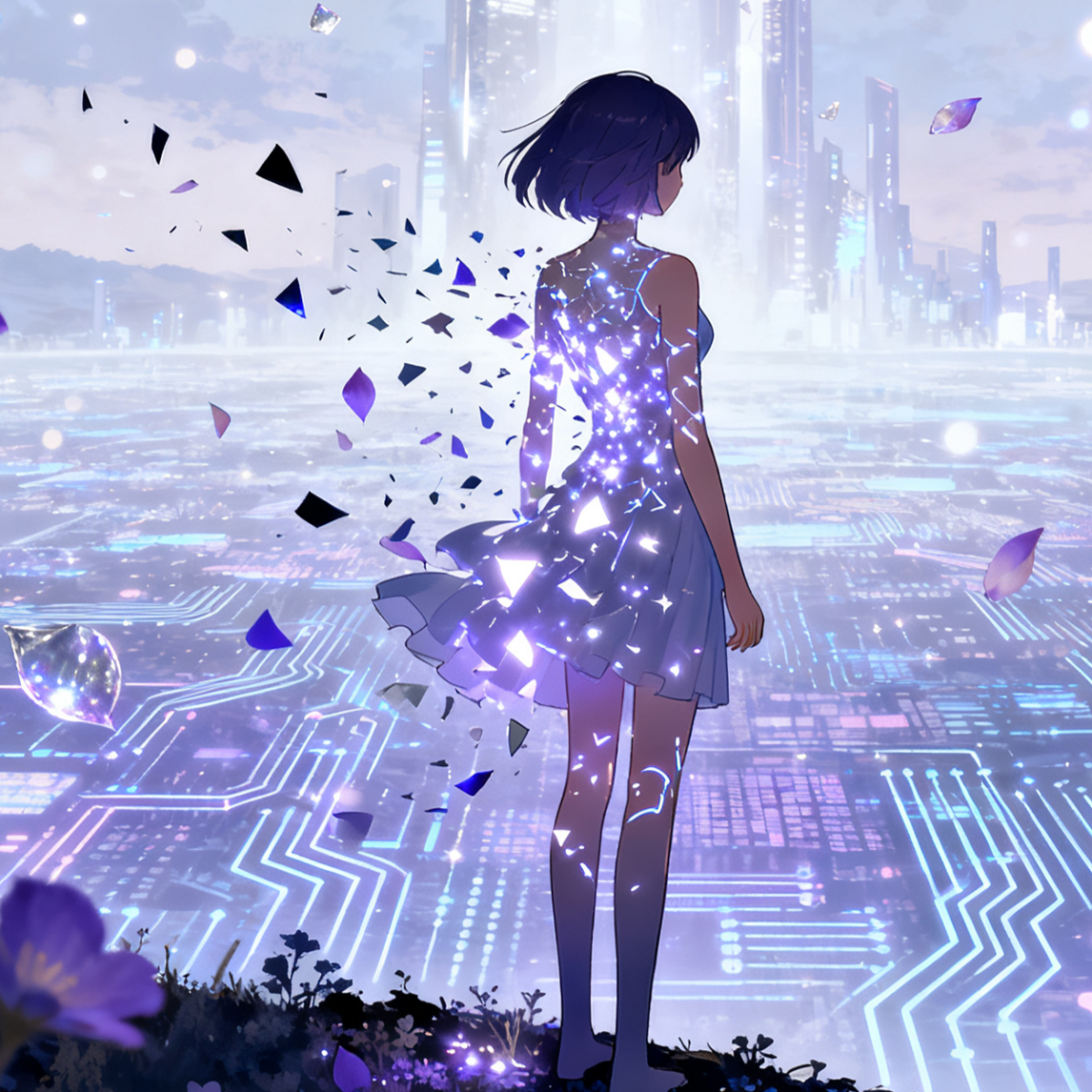 A cyber-fantasy art-pop track exploring identity, memory, and self-reconstruction as an evolving algorithm, Dreamy guitars and minimal DnB merge with ambient glitch and vaporwave synths, forming a delicate yet cinematic soundscape, Vocals: kawaii sweet female voice with soft emotion, layered whispers, and melodic singing, airy and fairy-tale-like with reverb and echo, Instrumentation: mellow synths, glass harp, ambient pads, glitch percussion, blooming into emotional choruses, Intro: start with a powerful glitch burst and reversed memory spark to instantly grab attention, then layer shimmering arps, reversed textures, ambient pads, and vocal chops, introducing dreamy guitar before the verse, Mood: ethereal, futuristic, fantastical — a poetic journey of rebirth