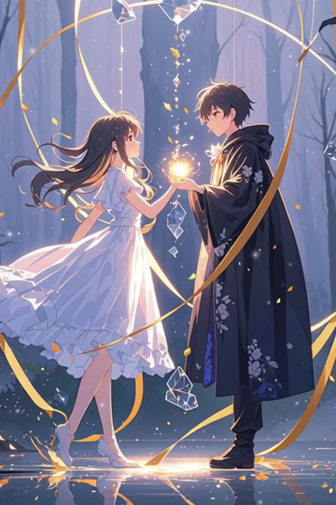 (sound design: 3D spatial mix, crystal piano lead, harp gliss, glass bell sparkles, reversed piano echoes, airy synth, subtle glitch particles, deep cello heartbeat, distant choir reverb)