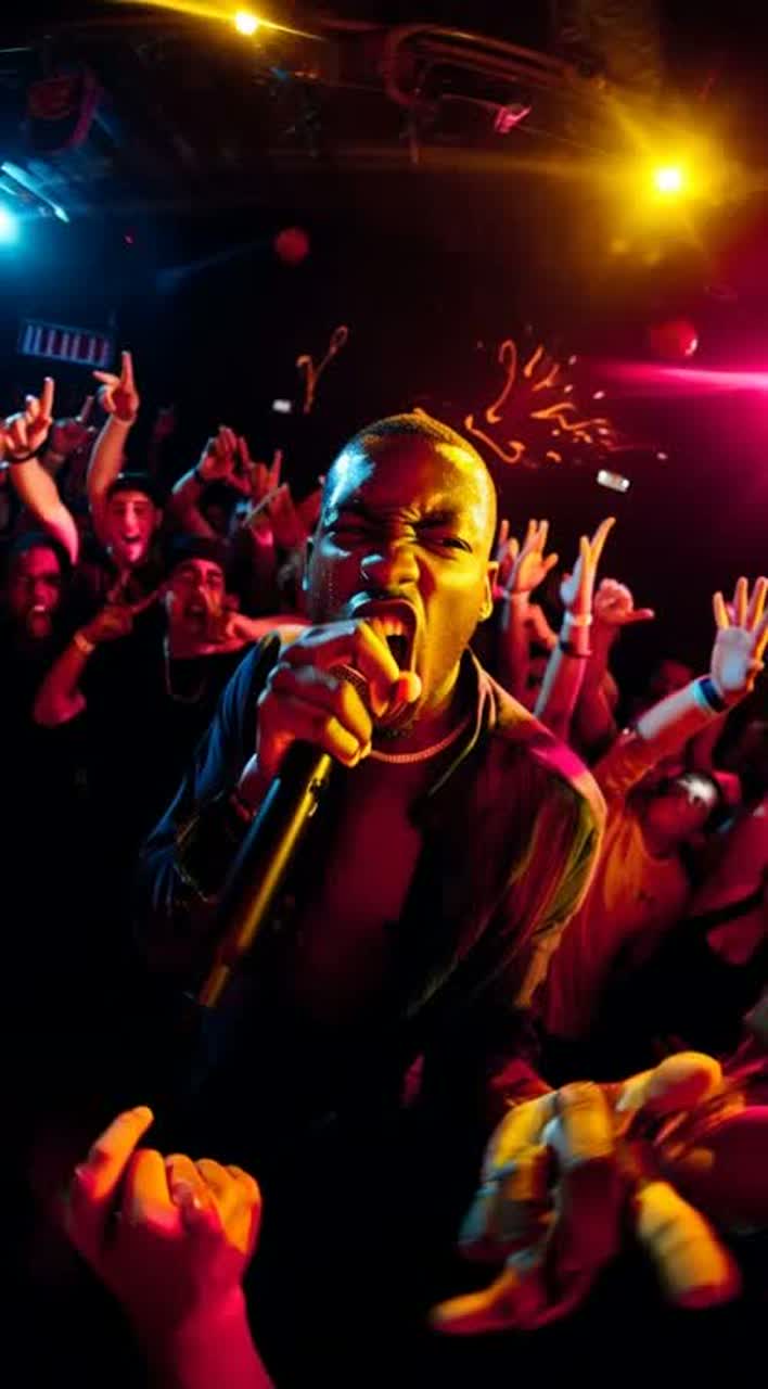 This fast rap club banger at 156 BPM fuses trap bounce and industrial grit: distorted 808 slides, punchy downbeat kicks, crisp claps/rimshots on 2 and 4, stuttered triplet hats, metallic brass stabs, tom fills, white noise swells, tape stops, and glitched risers, Saturated, aggressive bass pumps beneath cocky male vocals spitting precise sixteenth bursts and triplet pivots, with upfront consonants, Hooks use shouted call-response chants, stacked doubles, and gang backups; ad libs are wide-panned with slapback and micro throws, Structure: 2-bar cold open, immediate drop, 16-bar verses, 8-bar hooks, 8-bar bridge that spikes energy, then a final hook with extra vocal stacks, The mix is bright, physical, with clipped punch and wide percussion