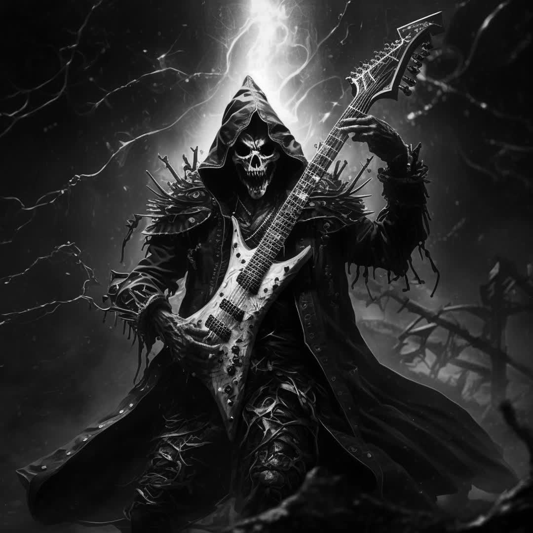 a piece of heavy, dark and percussive black metal with a big, melodious tapping solo towards the middle of the piece, On an ambient darkness theme, the background is oppressive, sometimes slow to suddenly start again in hypnotic dry riffs, inspired by trash metal, with at times the heaviness of death metal, the drums and powerful with a very dynamic solo break, mastering is powerful and clean, a little bit of compression