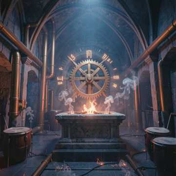 medieval techno, hardstyle, 135 BPM, bagpipe drones, taiko ensemble, frame drum patterns, low tibia pipes, distorted 303 bassline, gated snare reverb, tape saturation, ritual chants, stomping four-on-floor, syncopated fills, archaisch kraftvoll, dusk-club energy